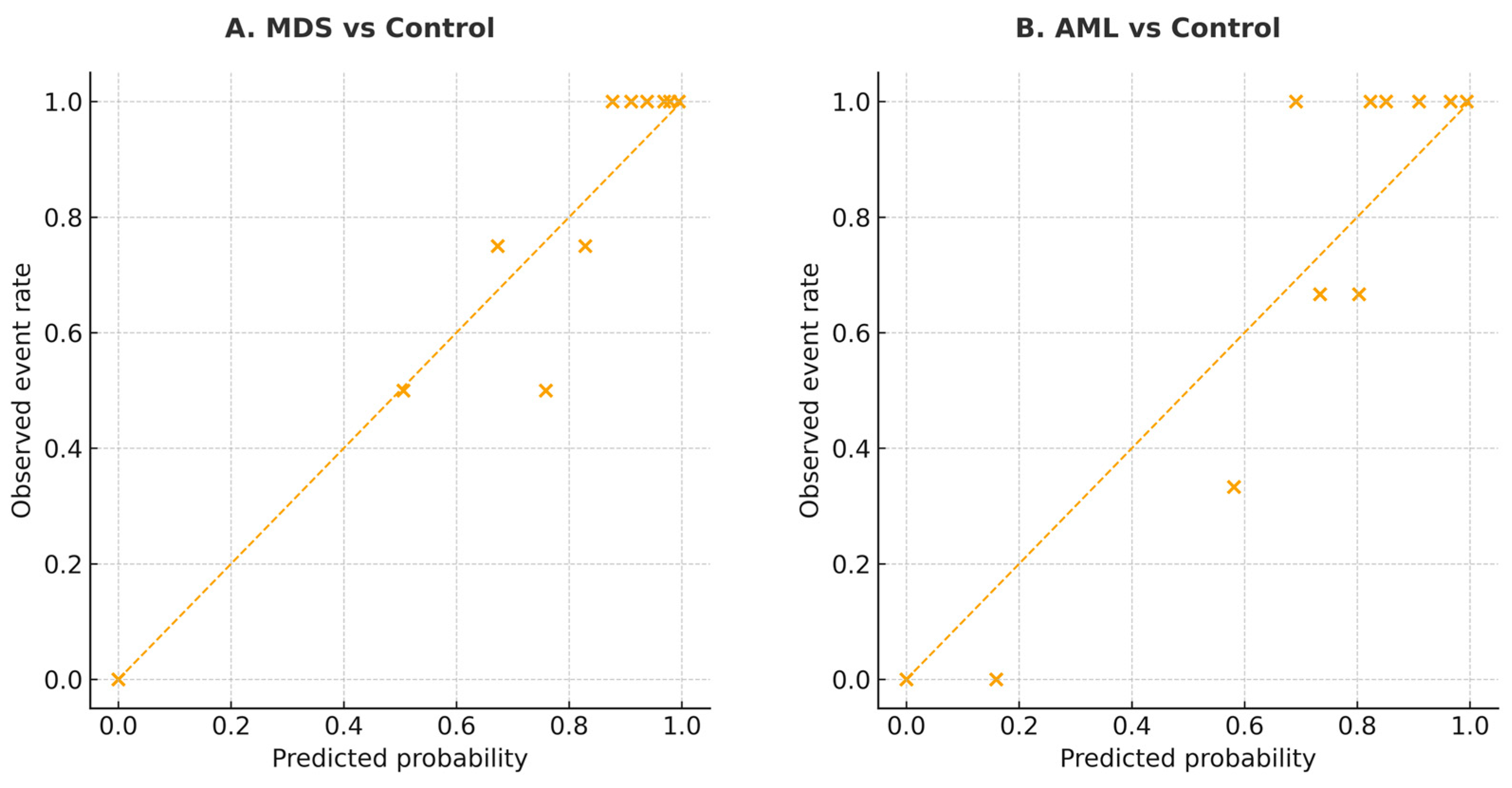 Figure 7, both MDS and AML models demonstrated good calibration, with data points lying close to the ideal 45° line. This indicates that the predicted probabilities generated by the five-gene model are well aligned with the actual frequency of disease, supporting the reliability of this logistic model across probability ranges.