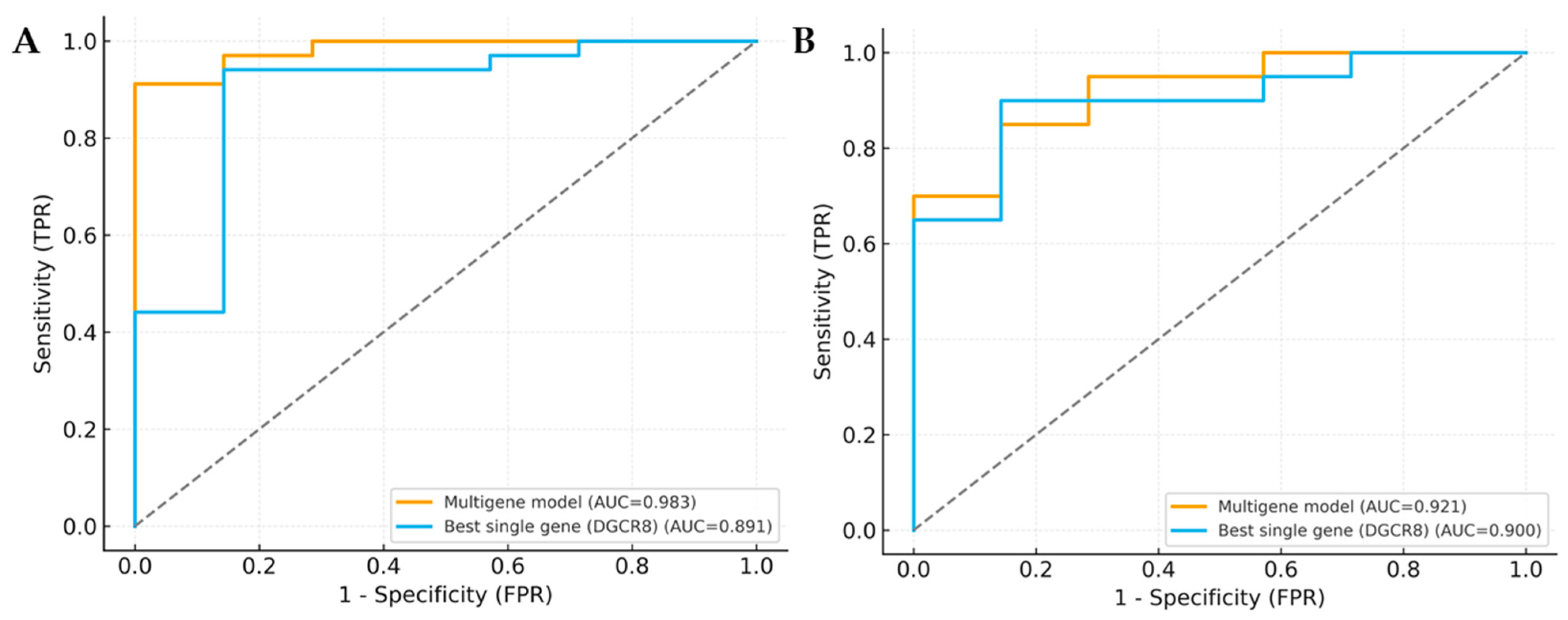 AGO1. Compared to the best-performing single gene, the multigene model achieved higher overall discriminative power in both MDS and AML cohorts. The model yielded an AUC of 0.978 for MDS and 0.982 for AML, indicating excellent diagnostic accuracy. When compared with the top single gene (