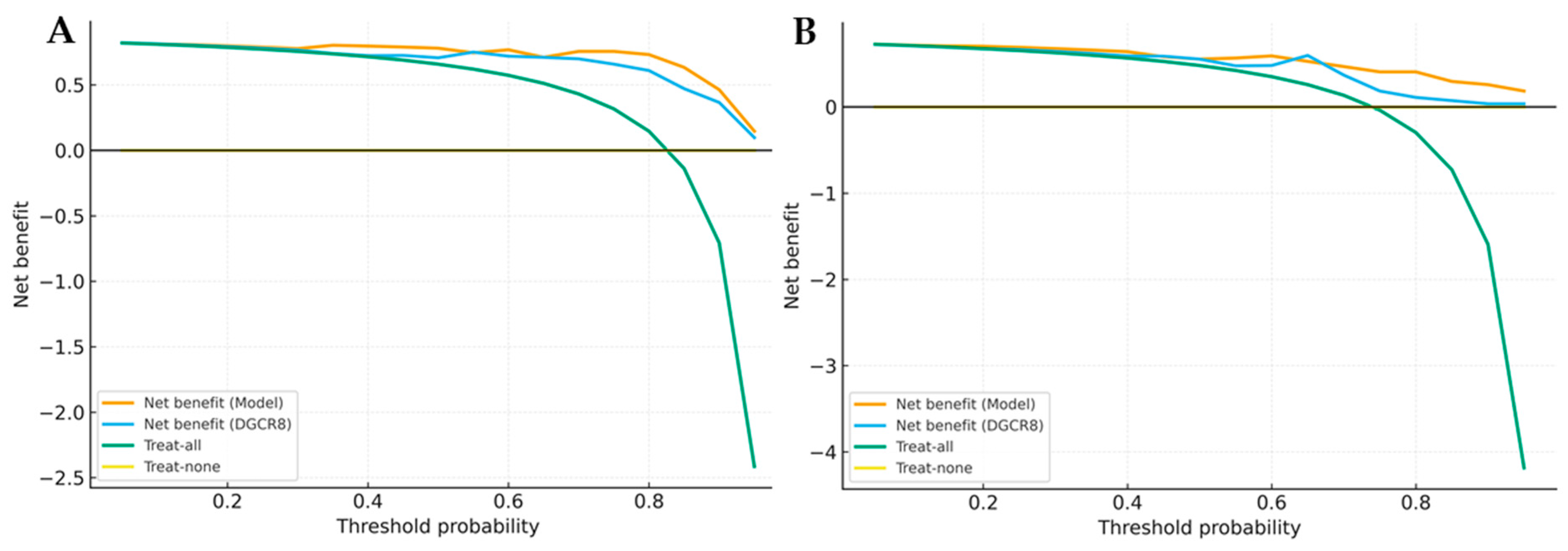 Figure 9A,B, the multigene model consistently provided a higher net clinical benefit across a broad range of threshold probabilities compared with “treat-all” and “treat-none” strategies.