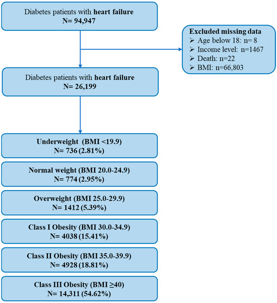 A total of 94,499 heart failure patients with type 2 diabetes were identified. After excluding patients with missing BMI or mortality data, 26,199 patients were included in the final analysis (Figure 1).