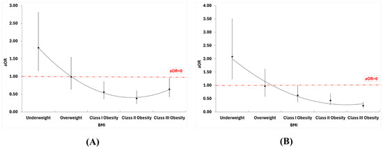 Figure 2. Adjusted odds ratio for (A) mortality and (B) cardiogenic shock across different BMI classes.