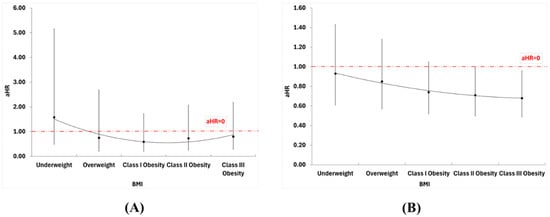 Among the 26,999 initially hospitalized patients, 487 (1.8%) died, and 25,712 (95.2%) were discharged. Of the 11,278 readmitted patients, 6829 had BMI data available and were subsequently followed up for one calendar year. Compared to normal weight, obesity class I [HR = 0.41 (95% CI: 0.14–1.19)], obesity class II [HR = 0.48 (95% CI: 0.17–1.36)], and obesity class III [HR = 0.46 (95% CI: 0.17–1.25)] were not associated with a statistically significant lower risk of 1-year mortality. The results were unchanged after adjustment (Table A5, Figure 3A).