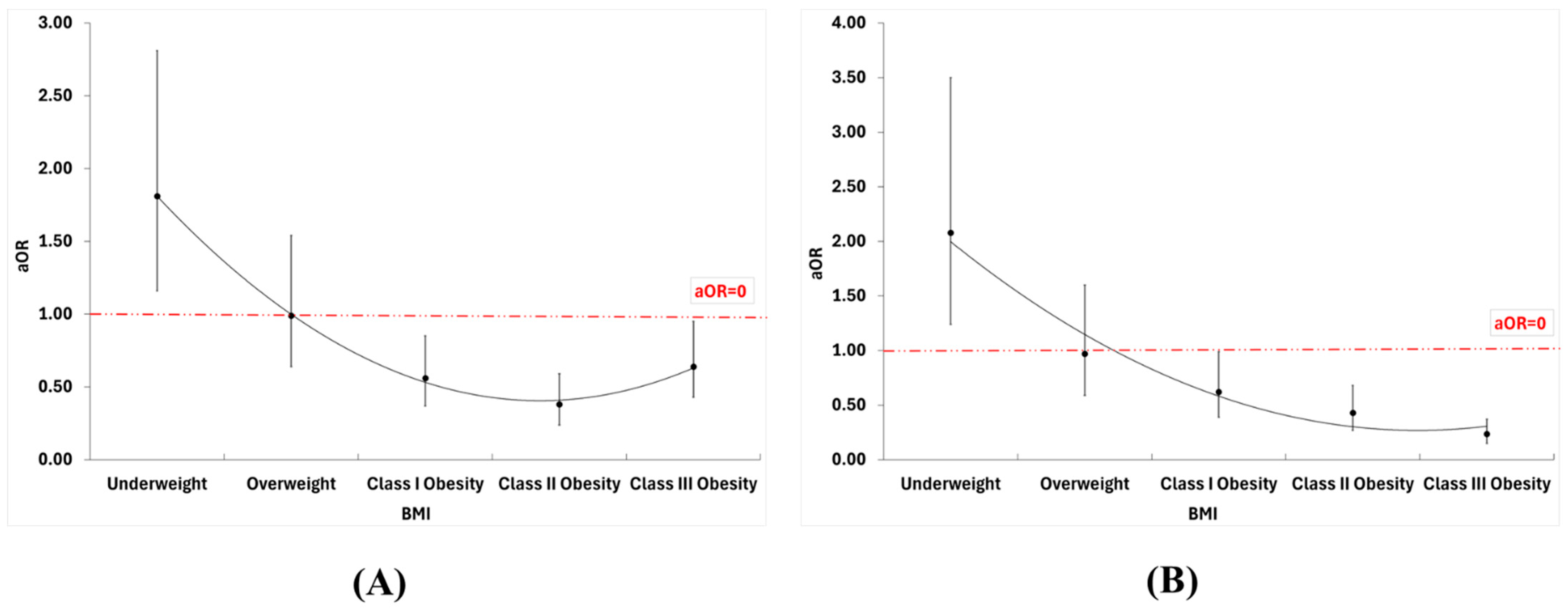 - Salman, A.; Saad, M.; Batool, R.M.; Ibrahim, Z.S.; Waqas, S.A.; Ahmed, S.Z.; Ahsan, S.I.; Aisha, E.; Aamer, H.; Sohail, M.U.; et al. Obesity paradox in coronary artery disease: National inpatient sample analysis. Coron. Artery Dis. 2025, 36, 294–302. [Google Scholar] [CrossRef] [PubMed]