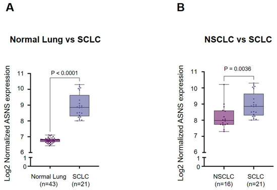 Expression of ASNS in normal lung, non-small cell lung cancer (NSCLC), and small cell lung cancer (SCLC). (A,B) Data were obtained from the NCBI Gene Expression Omnibus (GSE40275). Samples were classified based on the “Source name” annotation: normal lung (n = 43), NSCLC (n = 16), and SCLC (n = 21). The y-axis represents ASNS expression (log2 normalized). Box plots display median values with interquartile ranges, whiskers indicate minimum to maximum values, and dots represent individual samples. Statistical comparisons using unpaired two-tailed Student’s t-tests showed significantly higher ASNS expression in SCLC compared with normal lung (p < 0.0001) and NSCLC (p = 0.0036).