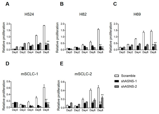 Previous studies using SCLC and patient-derived xenograft (PDX) models engineered with lentiviral shRNA or CRISPR-Cas9-mediated ASNS loss have experimentally validated the functional necessity of ASNS, showing that ASNS depletion markedly impairs proliferation, metabolic fitness, and survival under both basal and stress conditions [32,33]. In these reports, detailed cell cycle and apoptosis analyses revealed robust early G1 arrest, increased TUNEL positivity, and mitochondrial depolarization, findings that are consistent with observations in gastric, breast, and melanoma models [25,32,33]. Transcriptomics and phosphoproteomic analyses reported in prior studies revealed that ASNS knockdown initiated a rapid shutdown of mTOR signaling, increased expression of ATF3/4, DDIT3/CHOP, and induced a marked integrated stress response in line with previous observations [34,35]. Crucially, dual targeting of ASNS and asparagine uptake—either by L-asparaginase or CRISPR knockout of select SLC transporters—produced synthetic lethality, as observed in both solid and hematologic tumor models [36]. To determine the significance of ASNS in SCLC development, we tested whether knockdown of ASNS using a doxycycline-inducible lentiviral vector for eight days. The shRNA-mediated ASNS knockdown significantly impaired the proliferation of both mouse SCLC cells (mSCLC-1 and mSCLC-2) and human SCLC cell lines (NCI-H524, NCI-H82, NCI-H69) in MTT assays conducted over 8 days. In mouse SCLC cells, two independent shRNAs reduced relative proliferation to approximately 0.2–0.4 compared to scramble controls by day 8, with statistically significant differences. Similarly, human SCLC lines showed dose-dependent growth suppression, limiting proliferation to 0.4–0.6 of control levels across all tested lines (Figure 3A–E). These consistent effects across species and multiple shRNA sequences confirm the specificity of ASNS in sustaining SCLC cell viability and expansion. Taken together, these data demonstrate that ASNS is essential for promoting SCLC proliferation.