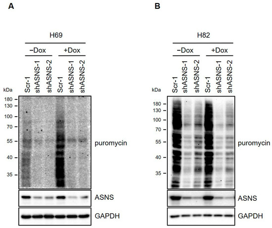 Knockdown of ASNS decreased ribosomal transcription programs. (A,B) Immunoblots for puromycin incorporation in nascent proteins. Two-hundred-thousand cells were treated with 10 µg of puromycin for 10 min. GAPDH is used as a loading control.