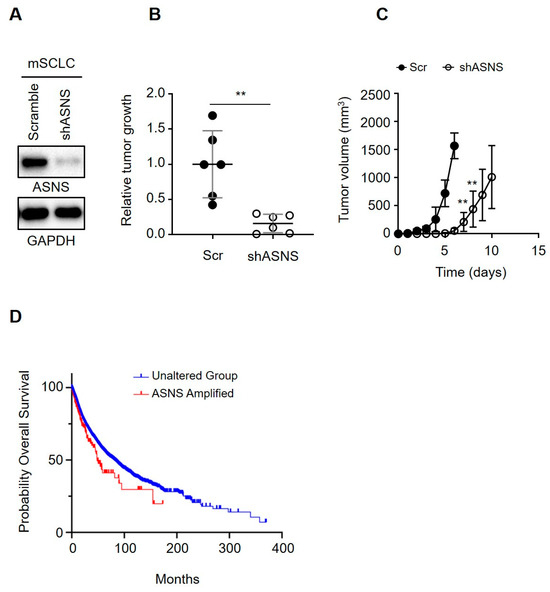 Overall survival by ASNS amplification in the TCGA PanCancer Atlas cohort. (A) Immunoblots for ASNS in mouse SCLC cells. GAPDH is used as a loading control. (B,C) Quantification of allograft tumors over time, following injection of mice with control and Asns-knockdown mouse SCLC cells (right) and of subcutaneous tumors >1.5 cm in diameter, where relative tumor growth represents tumor weight (g, grams) divided by latency (days after allograft; left). (D) Overall survival (OS) curves were generated using cBioPortal https://www.cbioportal.org/ (accessed on 15 September 2025). based on the TCGA PanCancer Atlas dataset (32 studies, 10,967 samples). Groups were defined as ASNS Amplified (cBioPortal “amplified”; 7 homozygous deletions removed; n = 161) versus Unaltered (diploid; n = 10,454). KM curves were generated with the cBioPortal Comparison/Survival module using GISTIC CNV data only. OS in months is shown for the two groups (red: Amplified, blue: Unaltered). ASNS amplification was associated with significantly worse overall survival (log-rank p = 0.0123; median OS, 48.69 vs. 80.74 months; HR = 1.44, 95 percent CI 1.08 to 1.92). **, p < 0.001. Statistical tests were performed using an unpaired t test. Error bar, SD.