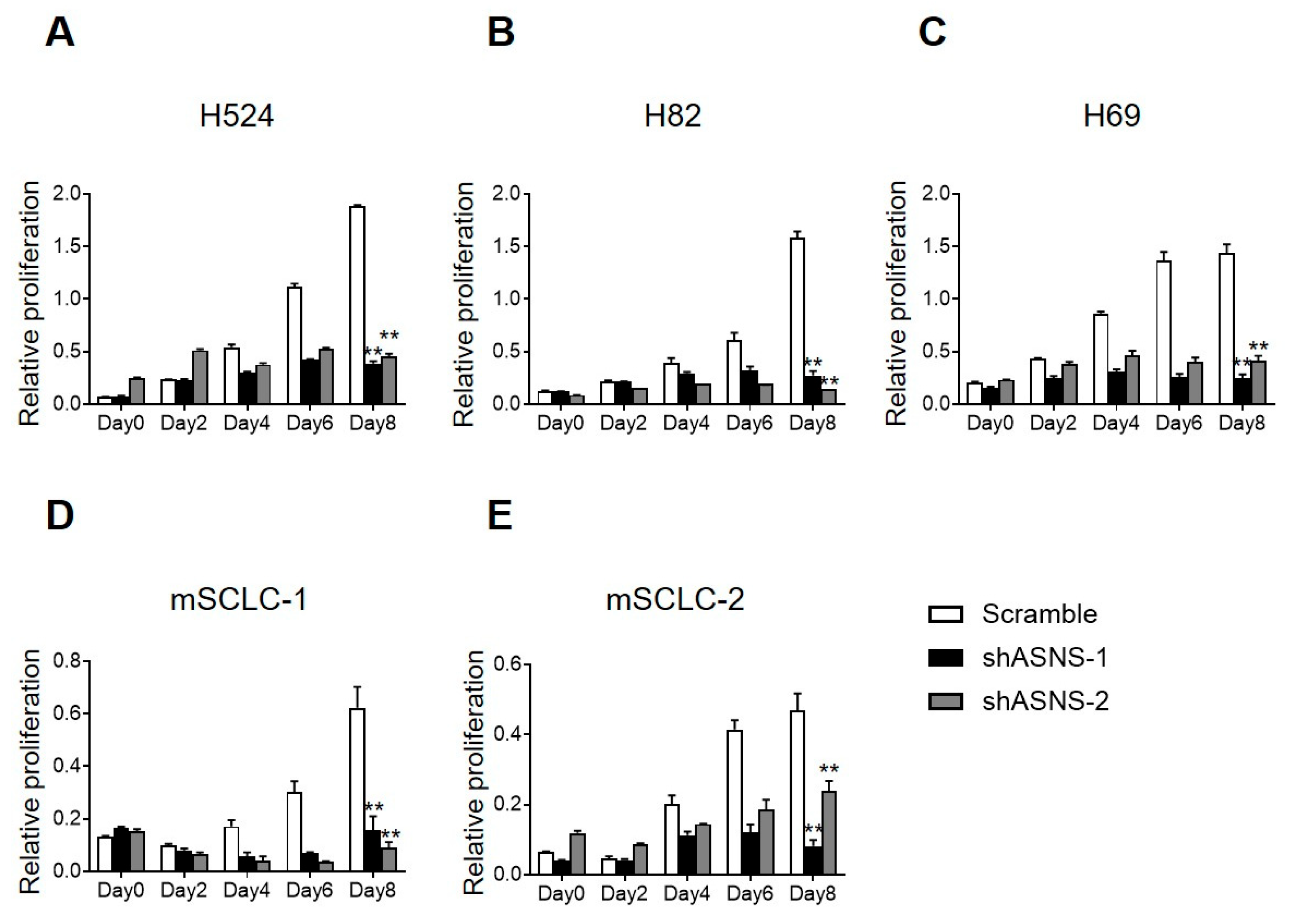 3.3. ASNS Promotes Tumorigenic Progression of Mouse and Human SCLC Cells