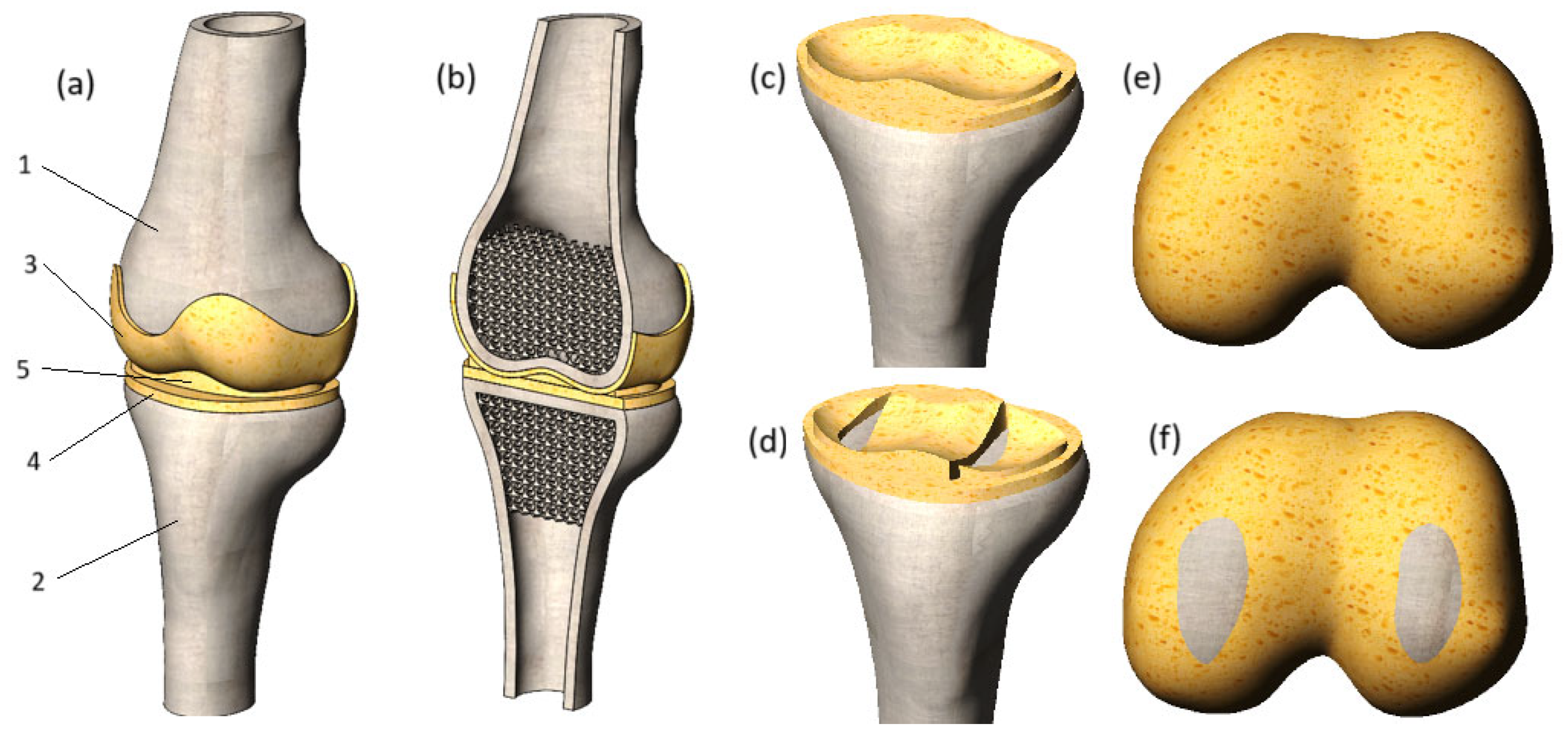 Figure 2d,f), which can appear in cases of trauma or long-term effects of degenerative impact. The damages to the tibia cartilage and meniscus were modeled by removing the volume of the cartilage component next to the surface of the bone. This method allowed the reflection of the longitudinal tear of the tissues. As for the femur cartilage, its integrity was compromised by replacing cartilage tissue with bone. As a result, the affected areas of the femur cartilage exhibit increased stiffness, which is uncharacteristic of healthy soft tissues and is likely to negatively impact the mechanical interaction of the joint components.