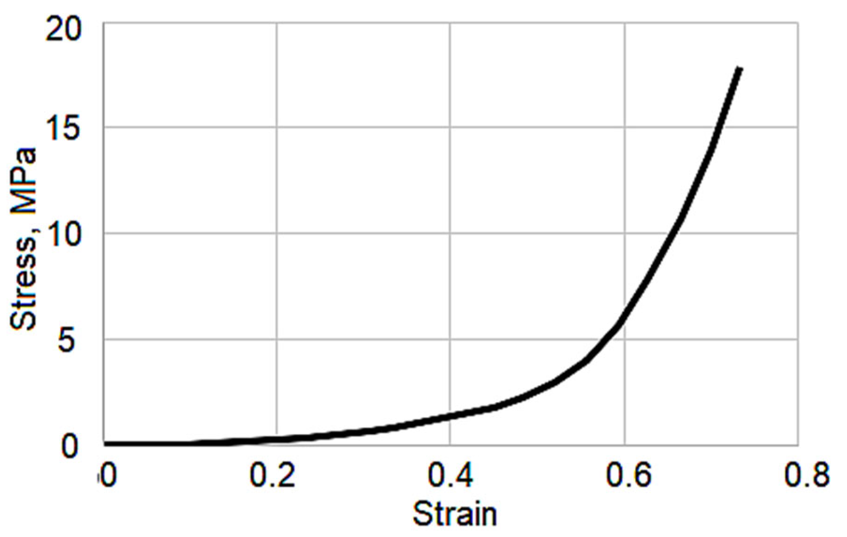 To incorporate the experimentally measured mechanical response of degenerated cartilage into the numerical model, the stress–strain loading and unloading curves were directly implemented in SolidWorks Simulation as tabulated material data. The software interpolates the tabulated points to obtain the tangent stiffness during each iteration, allowing the finite element model to reflect the viscoelastic-like hysteresis behavior observed in the experiments without assuming an a priori constitutive equation.