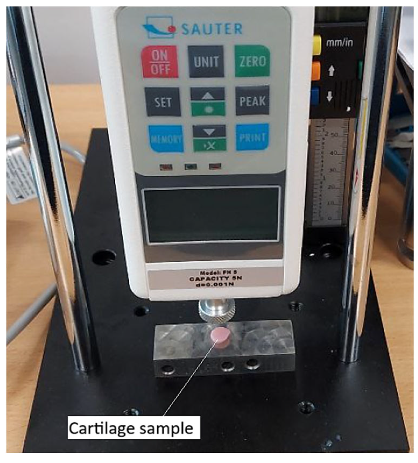 15], this research focuses on the effect of mild loads on stressing the model to the point of instability or exceeding the yield strength. For this purpose, we use highly sensitive equipment, such as the SAUTER FH 5 force gauge, (Kern & Sohn GmbH, Balingen, Germany),a to determine the mechanical properties of cartilage samples from differently damaged locations and to identify differences in their stressed state during loading and unloading. The study of the mechanical behavior of knee joint components under low loads may be useful for determining the intensity and frequency of both effective exercise recommended to maintain the health of patients with degenerative tissue diseases and for experimental studies on cartilage tissue samples.