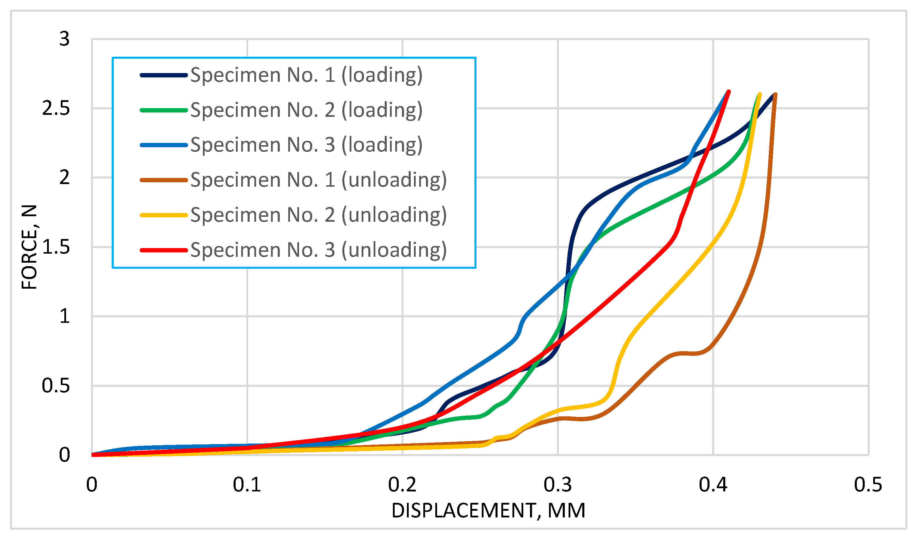 Figure 5, the graph illustrates the relationship between displacement (mm) and force (N) during the compression of degenerated cartilage specimens using a dynamometer. The data includes both loading and unloading cycles for three specimens. The loading curves for all specimens exhibit a nonlinear behavior, with a gradual increase in force as displacement progresses. In contrast, the unloading curves show a distinct hysteresis loop, which is characteristic of energy dissipation during the loading-unloading cycle.