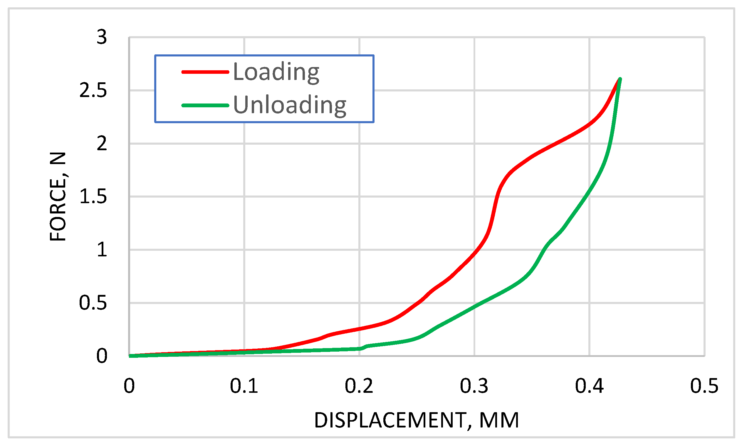 Figure 6. The graph presents the averaged force–displacement relationship derived from the loading and unloading curves of three degenerated cartilage specimens. The red curve represents the loading phase, while the green curve corresponds to the unloading phase. The averaged loading curve exhibits a characteristic nonlinear behavior, with a gradual increase in force at lower displacements, followed by a steeper rise as displacement progresses. This reflects the progressive stiffening of the cartilage under compression. The unloading curve is distinct from the loading curve, forming a hysteresis loop indicative of energy dissipation during the load-unload cycle. The area enclosed by the loop quantifies this energy loss, which is attributed to the viscoelastic properties and internal friction within the cartilage matrix. The smoothed nature of the averaged curves provides a clearer representation of the general mechanical response of degenerated cartilage to mild compressive loads, capturing both the elastic and energy-dissipative behavior of the tissue.