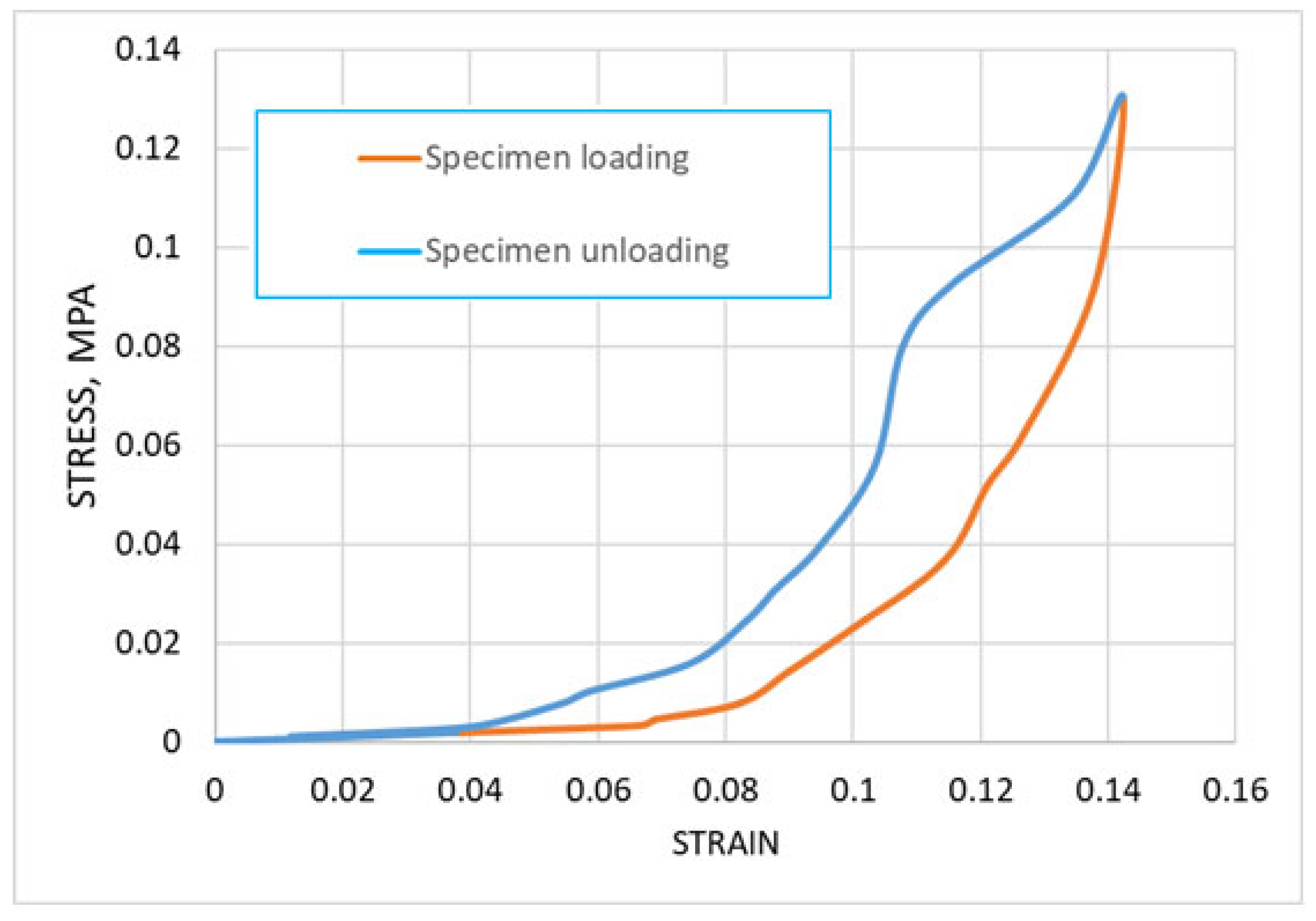 Figure 7. The graph illustrates the stress–strain relationship during the compression of degenerated cartilage specimens, with separate curves for the loading (blue) and unloading (orange) phases. The loading curve demonstrates an expected nonlinear increase in stress as strain progresses, with a gradual initial rise followed by a sharper increase at higher strain levels. This indicates the characteristic stiffening behavior of cartilage under compressive deformation. The unloading curve deviates from the loading curve, forming a hysteresis loop that could highlight the viscoelastic nature of the cartilage. The enclosed area between the loading and unloading curves represents the energy dissipated during the loading-unloading cycle. This energy loss is a result of internal friction and structural reorganization within the cartilage matrix. The transition from stress accumulation during loading to stress relaxation during unloading further emphasizes the mechanical and energy-absorbing properties of the tissue under compressive strain. This information can be valuable for understanding the mechanical behavior of degenerated cartilage under physiological loading conditions.