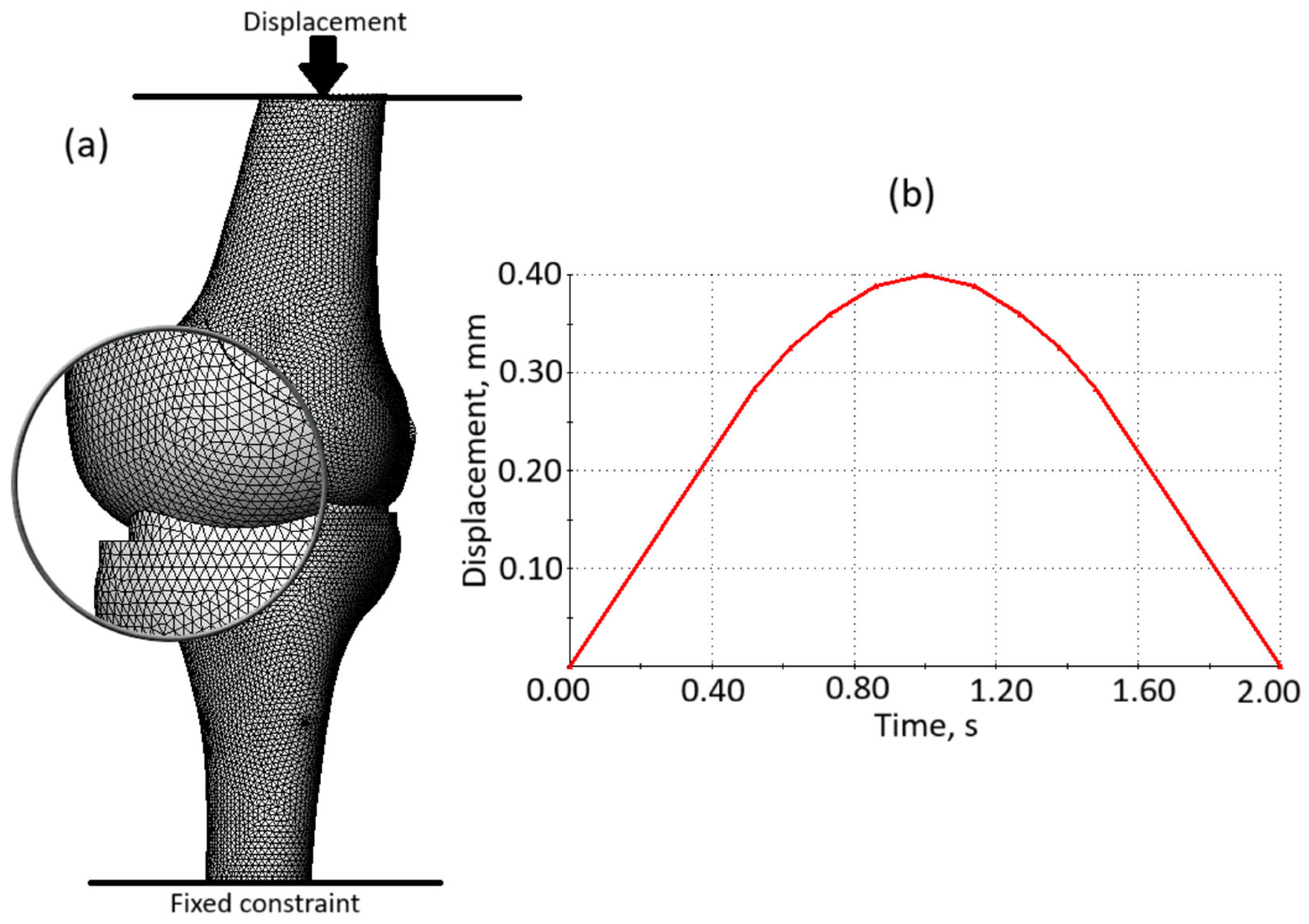 Figure 8a. As shown in the image, the finite element model is subjected to an external load in the form of displacement applied to the upper surface of the femur. This displacement is directed strictly vertically, inducing compression on the model. The lower surface of the tibia is fixed in place, ensuring that the model remains stationary during the application of the load.