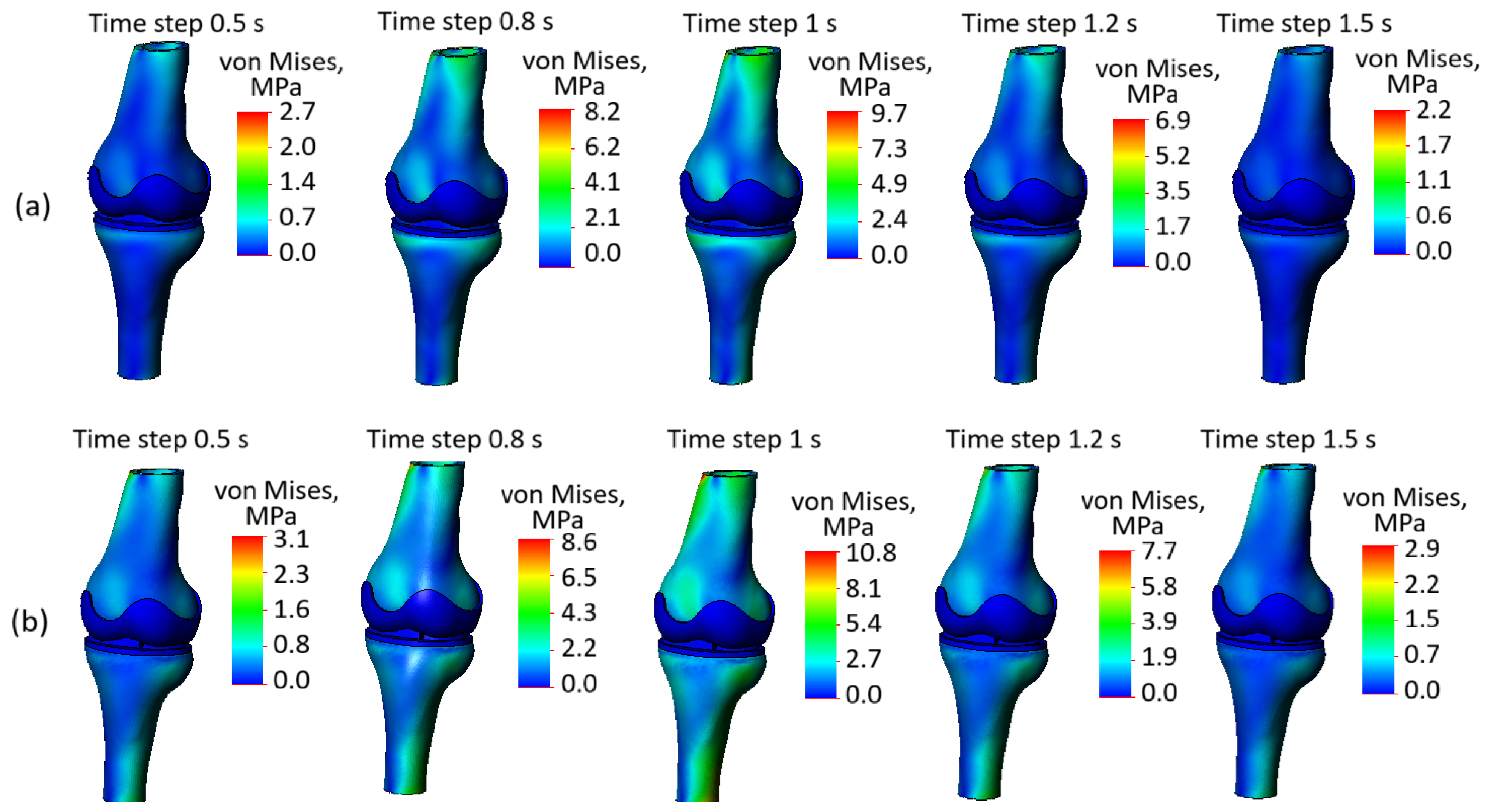 Figure 9. As we can see, the stress distribution depends both on the time step, which, in turn, determines the magnitude of the applied displacement, and on the integrity of the soft tissues. Furthermore, the stress values are directly influenced by the loading phase. The obtained plots demonstrate the von Mises stress distribution in the knee joint for two cases: one with intact soft tissues and another with compromised soft tissue integrity. The plots correspond to time steps of 0.5 s, 0.8 s, and 1 s (loading phase), while time steps of 1.2 s and 1.5 s correspond to the unloading phase.