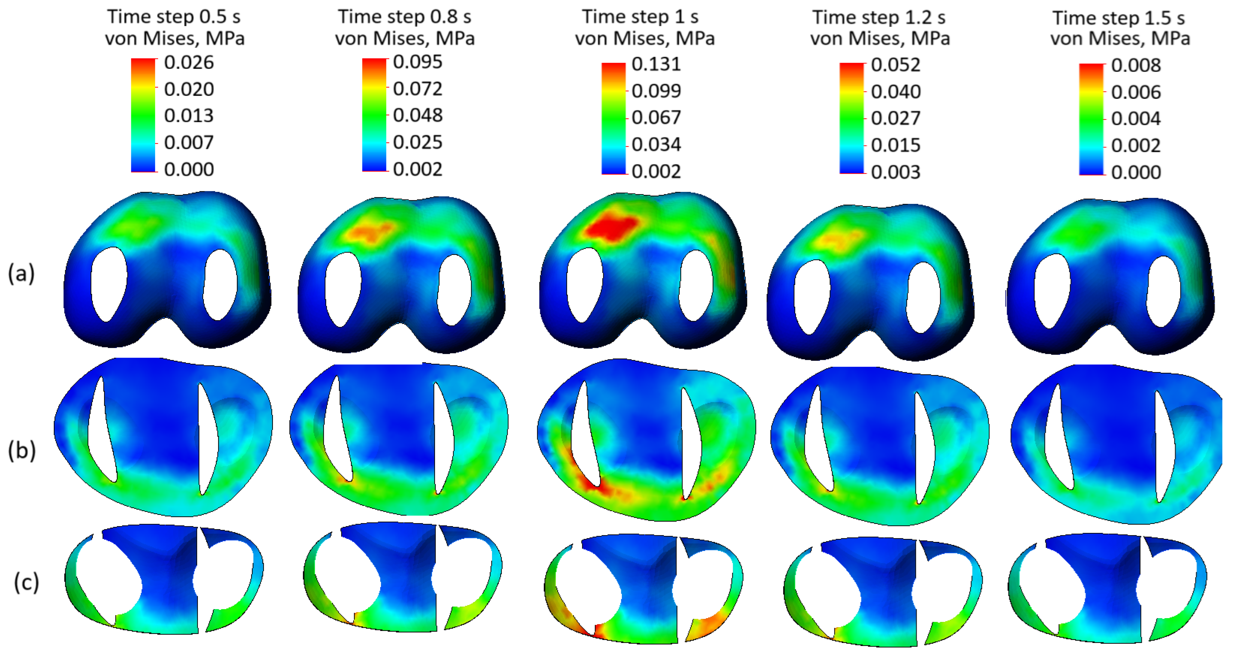 Figure 10b) exhibits a consistent and uniform stress distribution across the mentioned steps. The stress increases gradually during the loading phase, with some localized stress concentrators at the peak of the cycle. During unloading, the stress levels reduce evenly, indicating the tissue’s capability to distribute mechanical loads effectively.