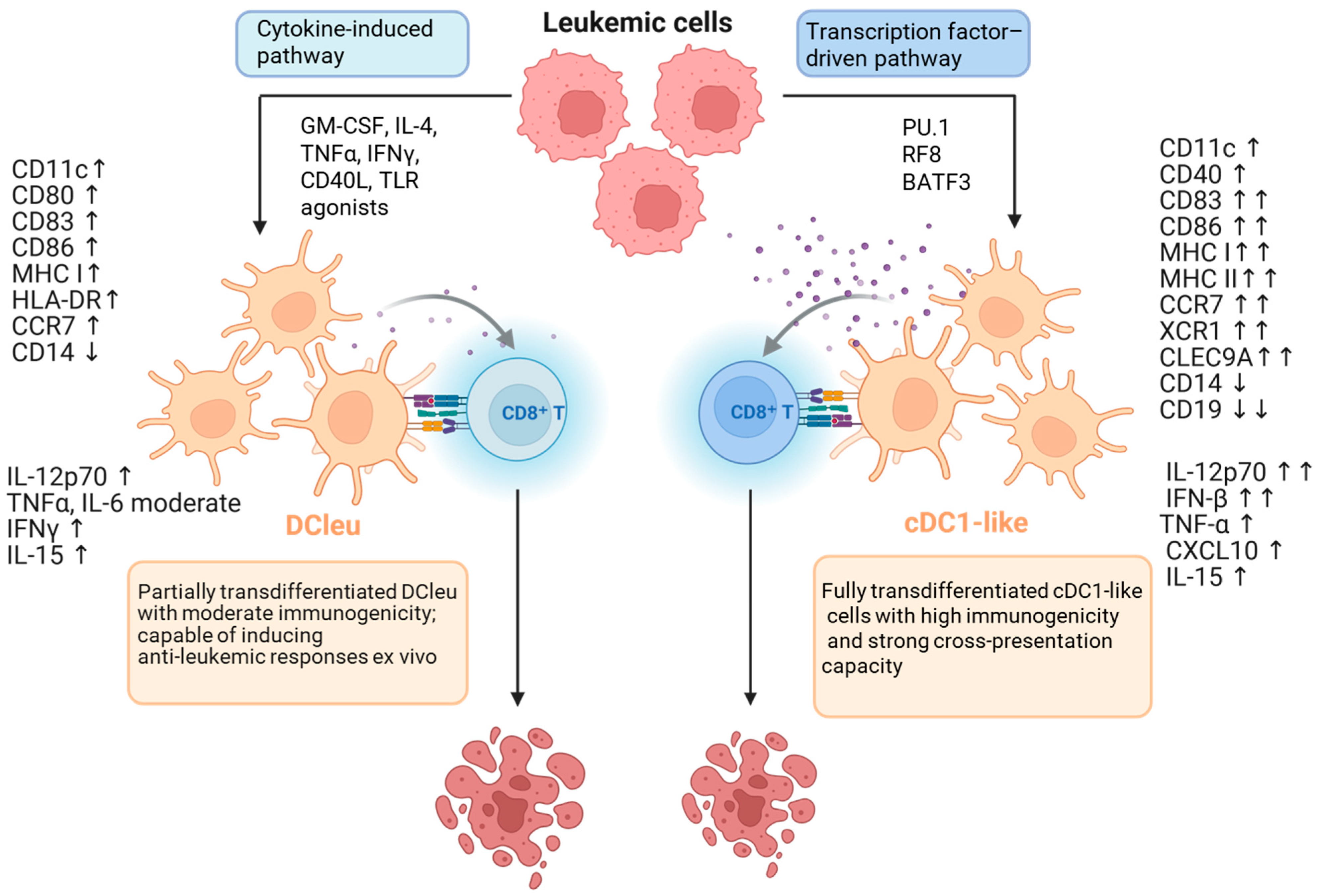 Two pathways of transdifferentiation of leukemia (AML) cells into dendritic cells (DCs). Left: the cytokine-driven (microenvironmental) pathway; stimulation with GM-CSF, IL-4 ± TNFα, CD40L, or TLR agonists activates the IRF8–BATF3 axis, leading to the generation of leukemia-derived dendritic cells (DCleu). These DCleu exhibit CD11c, CD86, and HLA-DR expression, secrete IL-12p70 and TNFα, and display moderate antigen-presenting capacity and T cell-stimulatory potential. This process reflects the intrinsic plasticity of leukemic cells under microenvironmental cues and enables their partial differentiation toward an immunogenic DC phenotype. Right: the transcription factor-driven pathway; enforced expression of C/EBPα, PU.1, IRF8, and BATF3 stably reprograms leukemic cells into cDC1-like cells characterized by expression of XCR1, CLEC9A, and CD141/BDCA3, along with strong secretion of IL-12 and IFN-β, enabling potent CD8+ T cell activation. Both mechanisms converge on the IRF8–BATF3 axis, but differ in the depth of epigenetic remodeling and stability of the immunogenic outcome. Analogous processes have been observed in B-ALL models, where the loss of PAX5 and activation of PU.1/IRF8 drive partial reprogramming of lymphoblasts into DC-like cells. Symbols at marker names reflect the direction and magnitude of change compared to the parental cell: moderate = moderate increase; ↑ = increase; ↑↑ = strong increase; ↓ = decrease; ↓↓ = strong decrease. (Based on [45,125,152,153,157,158,159].) Created in BioRender. Czogalla, A. (2025) https://BioRender.com/dwn4tyr, accessed on 11 December 2025.