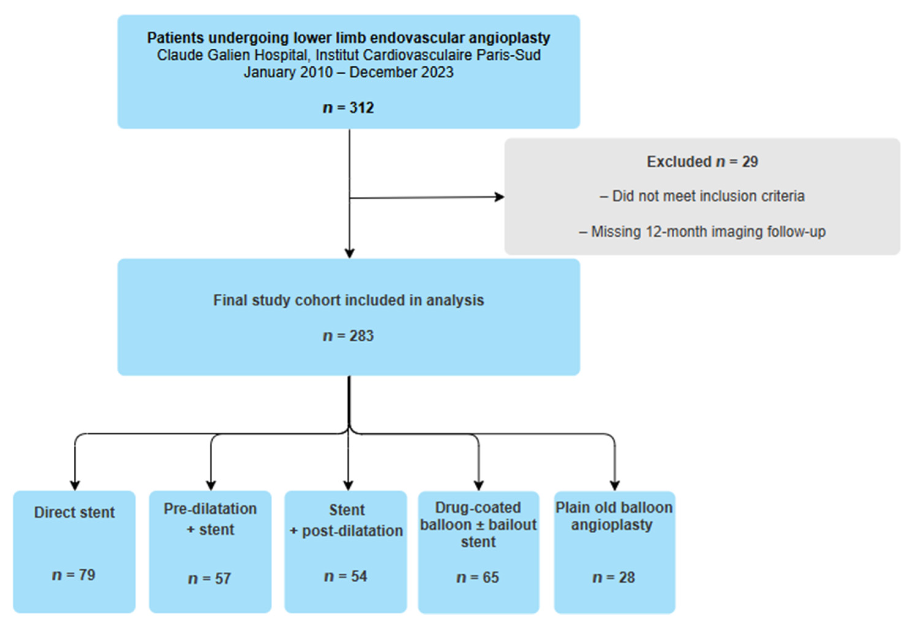 We conducted a single-center retrospective cohort study including all consecutive patients who underwent endovascular revascularization for symptomatic lower limb PAD between January 2010 and December 2023 at Claude Galien Hospital, Institut Cardiovasculaire Paris-Sud, France. Patients were eligible if they received percutaneous transluminal angioplasty (PTA) with at least one of the following strategies: (1) direct stent implantation, (2) pre-dilatation followed by stenting, (3) stenting with post-dilatation, (4) DCB with or without bailout stenting, or (5) POBA without stenting or drug application.