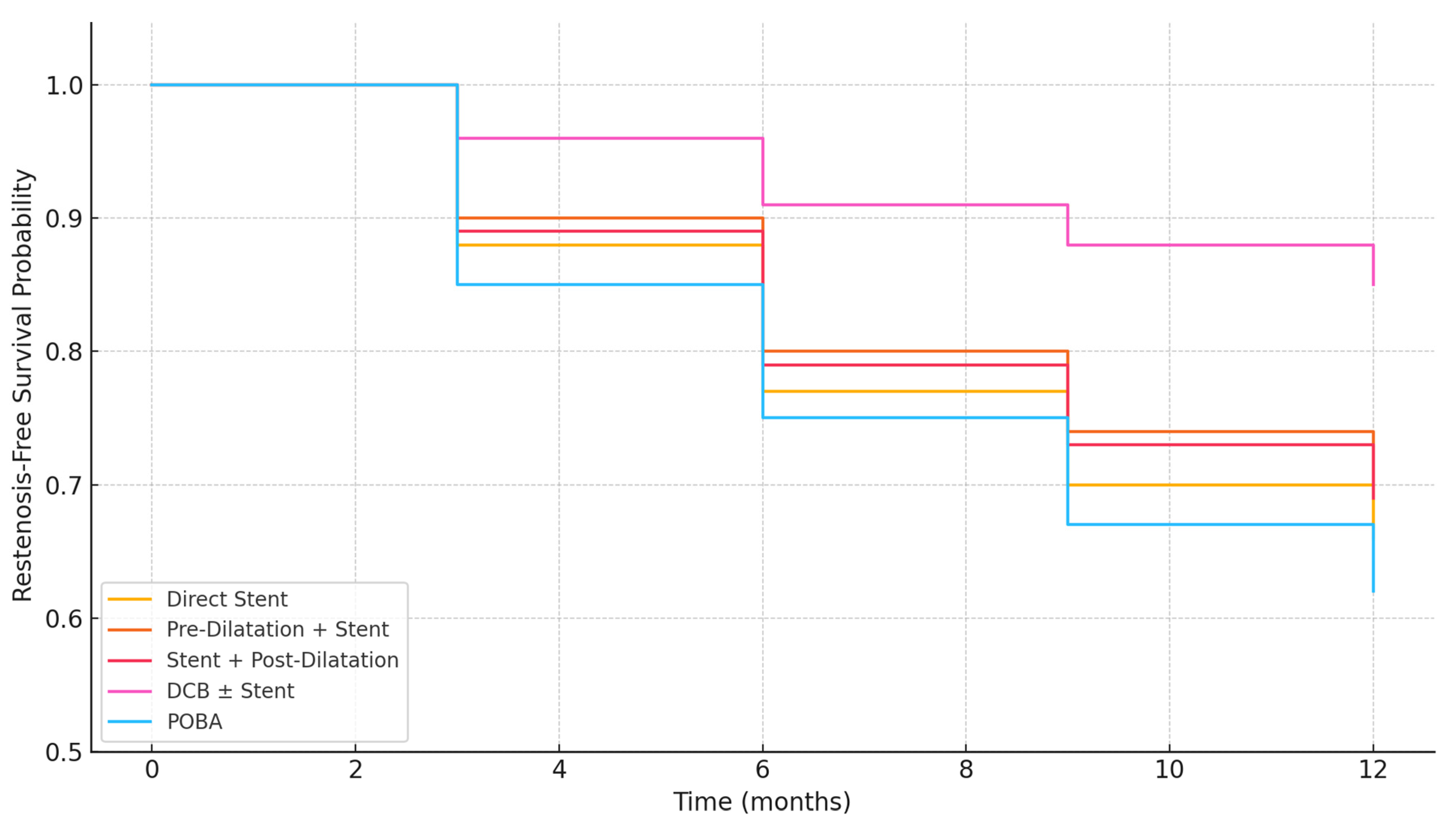 Kaplan-Meier estimates showed that restenosis-free survival at 12 months was significantly higher with DCB ± stent (84.6%) than with stent-based strategies (65.1–68.2%) or POBA (61.9%), with an overall log-rank p = 0.002.