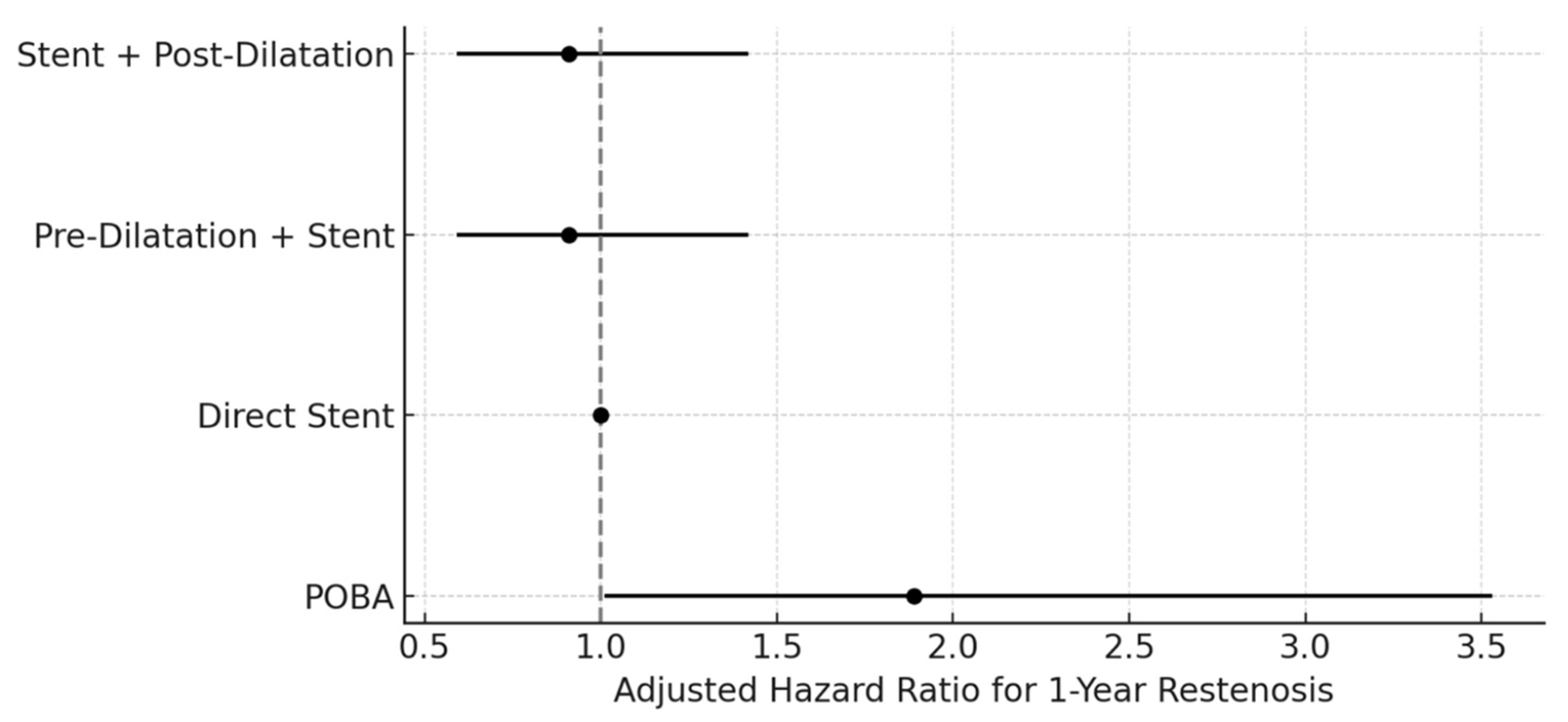 Figure 2). In the complementary model using DCB ± stent as the reference, POBA was associated with a higher hazard of restenosis (adjusted HR 1.89; 95% CI 1.01–3.53), while both stent-based strategies demonstrated no significant difference from DCB (