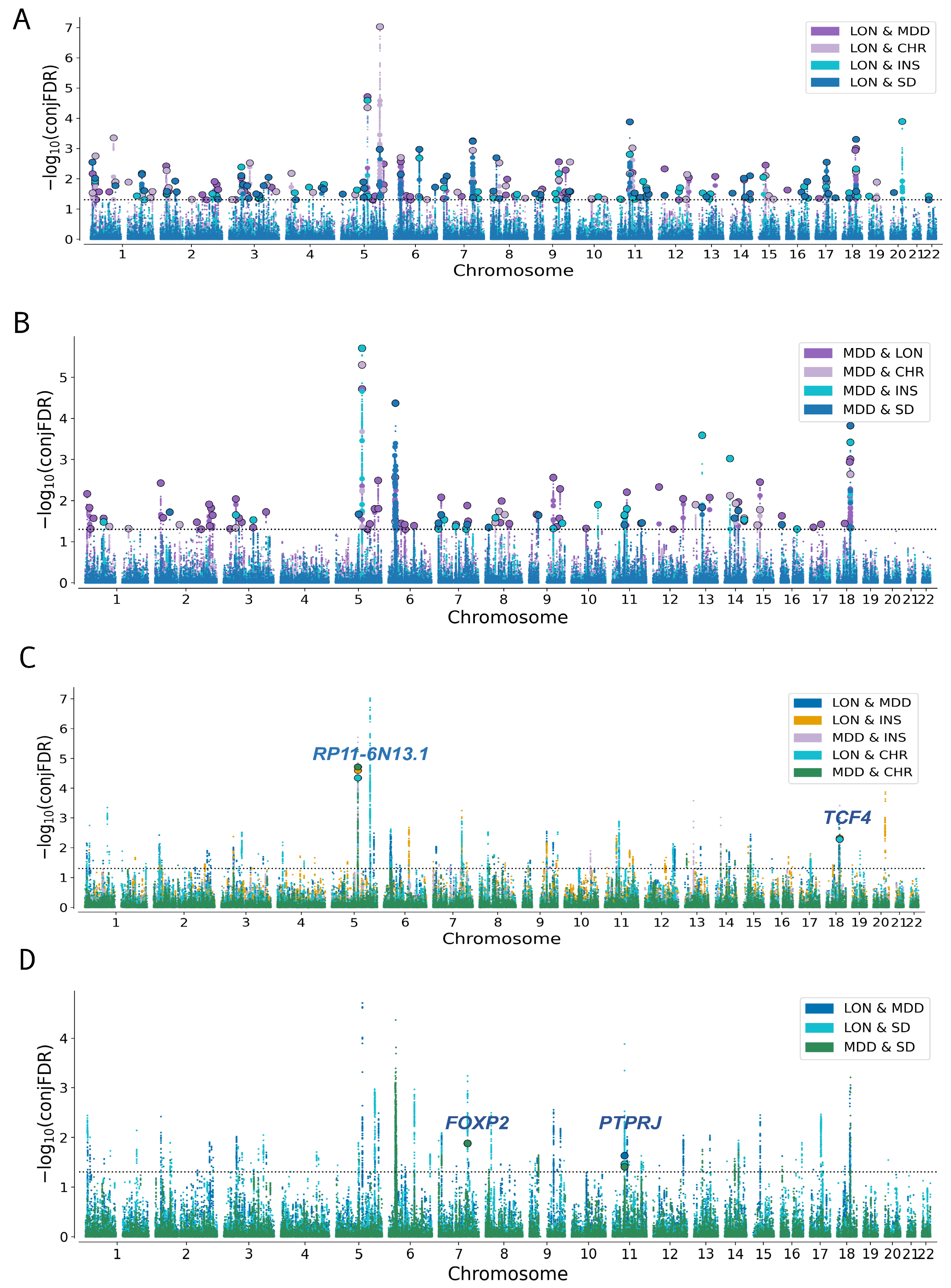 3.5. Association of Genomic Loci with LON, MDD and Sleep-Related Traits