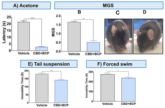 Effect of CBD and BCP in combination (8.3 mg/kg) in CCI-induced thermal hypersensitivity (A) and ongoing pain (B). Representative images of GMS from the vehicle (C) and CBD and BCP treatment (D). The effect of CBD and BCP in combination in the tail suspension (E) and the forced swim (F) tests. Data are presented as mean ± SEM. * p < 0.05, ** p < 0.01, *** p < 0.001, **** p < 0.0001. MGS, mouse grimace scale.
