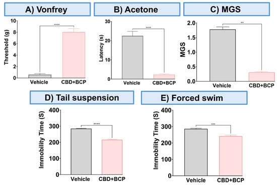 The combination of CBD and BCP reduced mechanical allodynia (Figure 3A, p < 0.0001, t-test, n = 5), thermal hypersensitivity (Figure 3B, p < 0.0001, t-test, n = 5), and ongoing pain (Figure 3C, p < 0.0001, t-test, n = 5). We also examined the effect of this combination on depression-like behaviors. The depression-like behaviors associated with neuropathic pain in the CCI model were significantly decreased by the CBD and BCP combination compared to the vehicle group in tail suspension (Figure 3D, p < 0.0001, t-test) and FST (Figure 3E, p < 0.001, t-test). Among the behavioral tests we performed (Figure 4) we found sex differences in the effect of this combination on mechanical allodynia (Figure 4A, t-test, p < 0.0001), MGS (Figure 4C, t-test, p < 0.01), and tail suspension (Figure 4D, t-test, p < 0.0001).