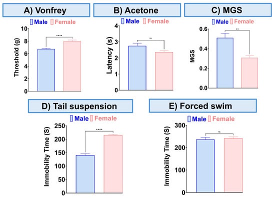 Sex differences in the effect of this combination (8.3 mg/kg) on mechanical allodynia (A), thermal hypersensitivity (B), MGS (C), and tail suspension (D), the forced swim test (E). Data are presented as mean ± SEM. ** p < 0.01, **** p < 0.0001.