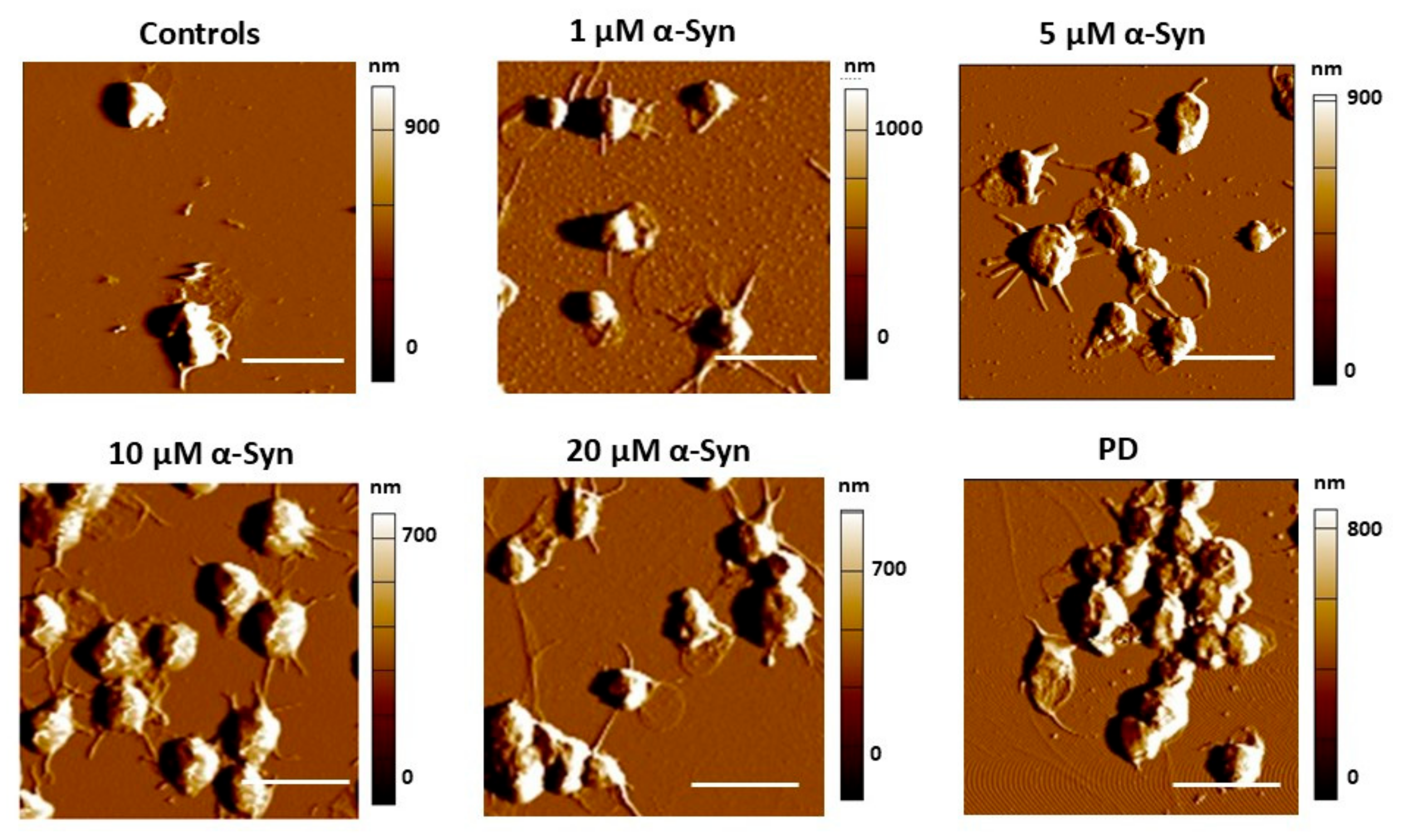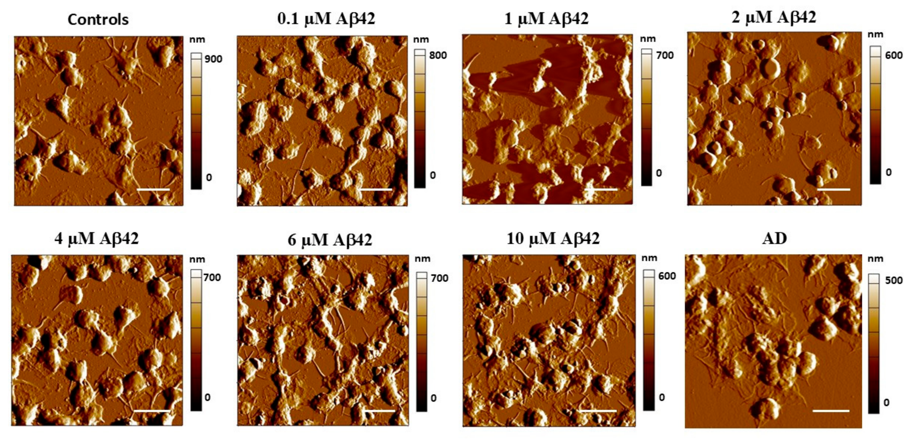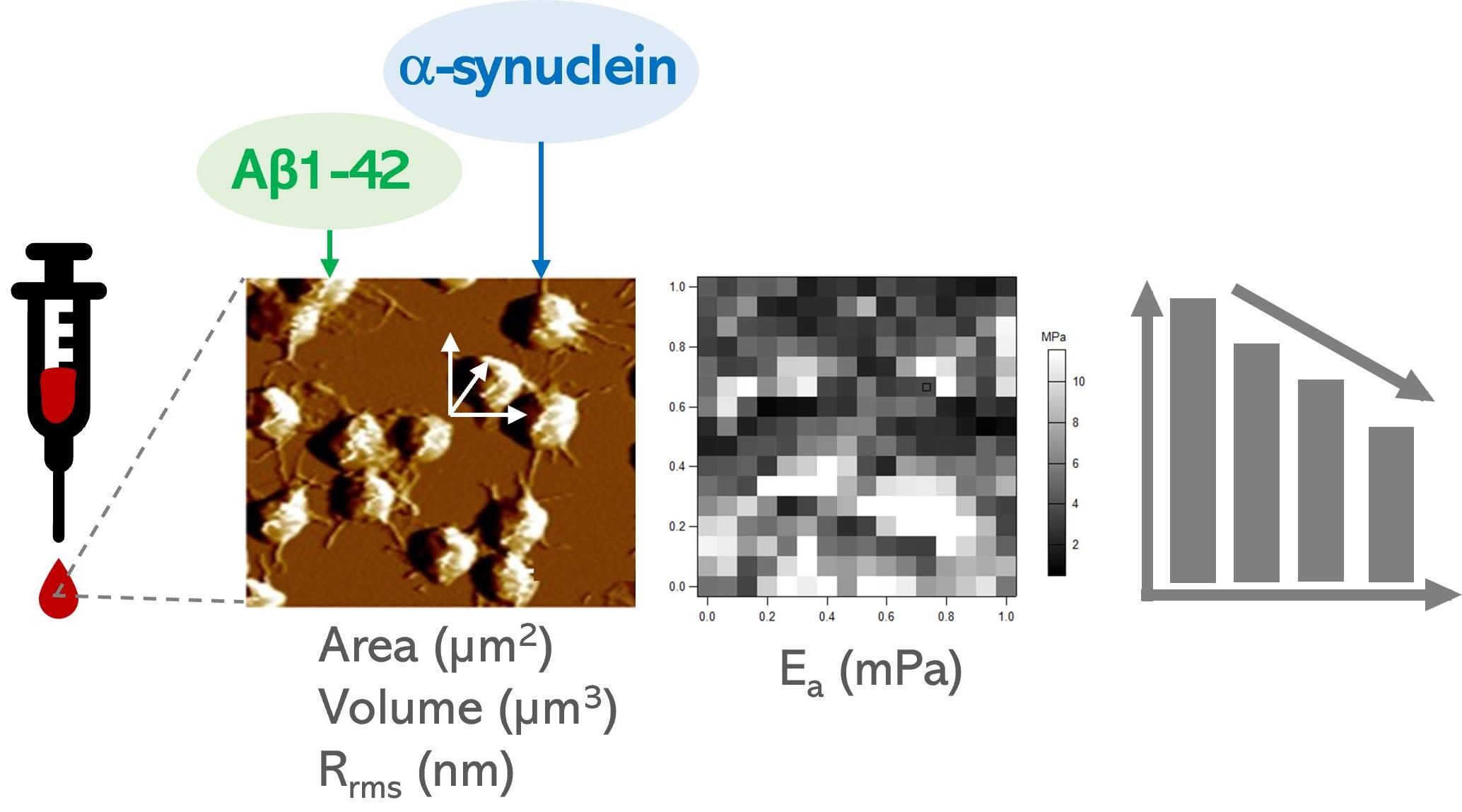 - Taneva, S.G.; Todinova, S.; Andreeva, T. Morphometric and Nanomechanical Screening of Peripheral Blood Cells with Atomic Force Microscopy for Label-Free Assessment of Alzheimer’s Disease, Parkinson’s Disease, and Amyotrophic Lateral Sclerosis. Int. J. Mol. Sci. 2023, 24, 14296. [Google Scholar] [CrossRef]