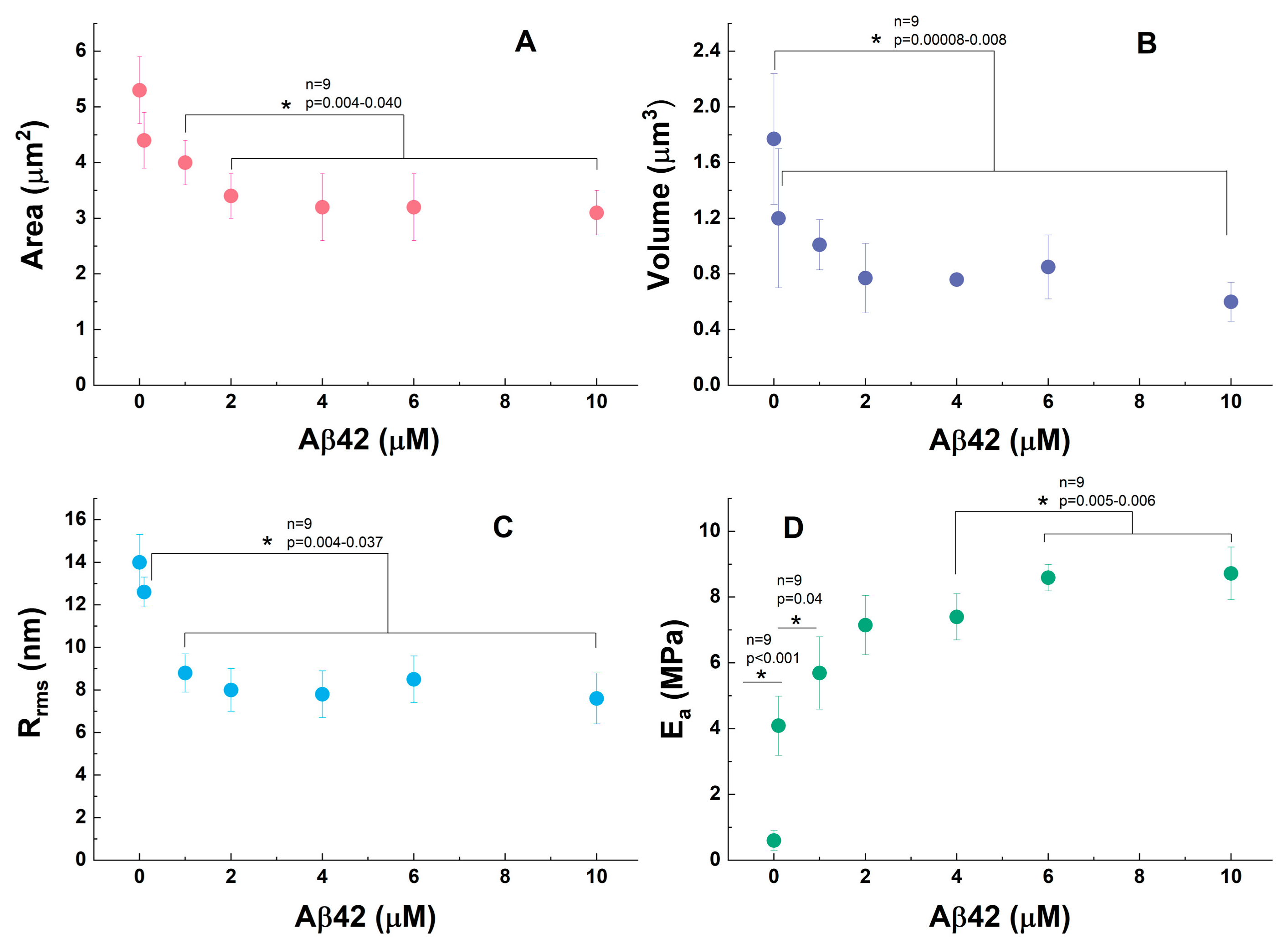 3.2. Nanomechanical Properties of Amyloid Aβ42-Treated Platelets