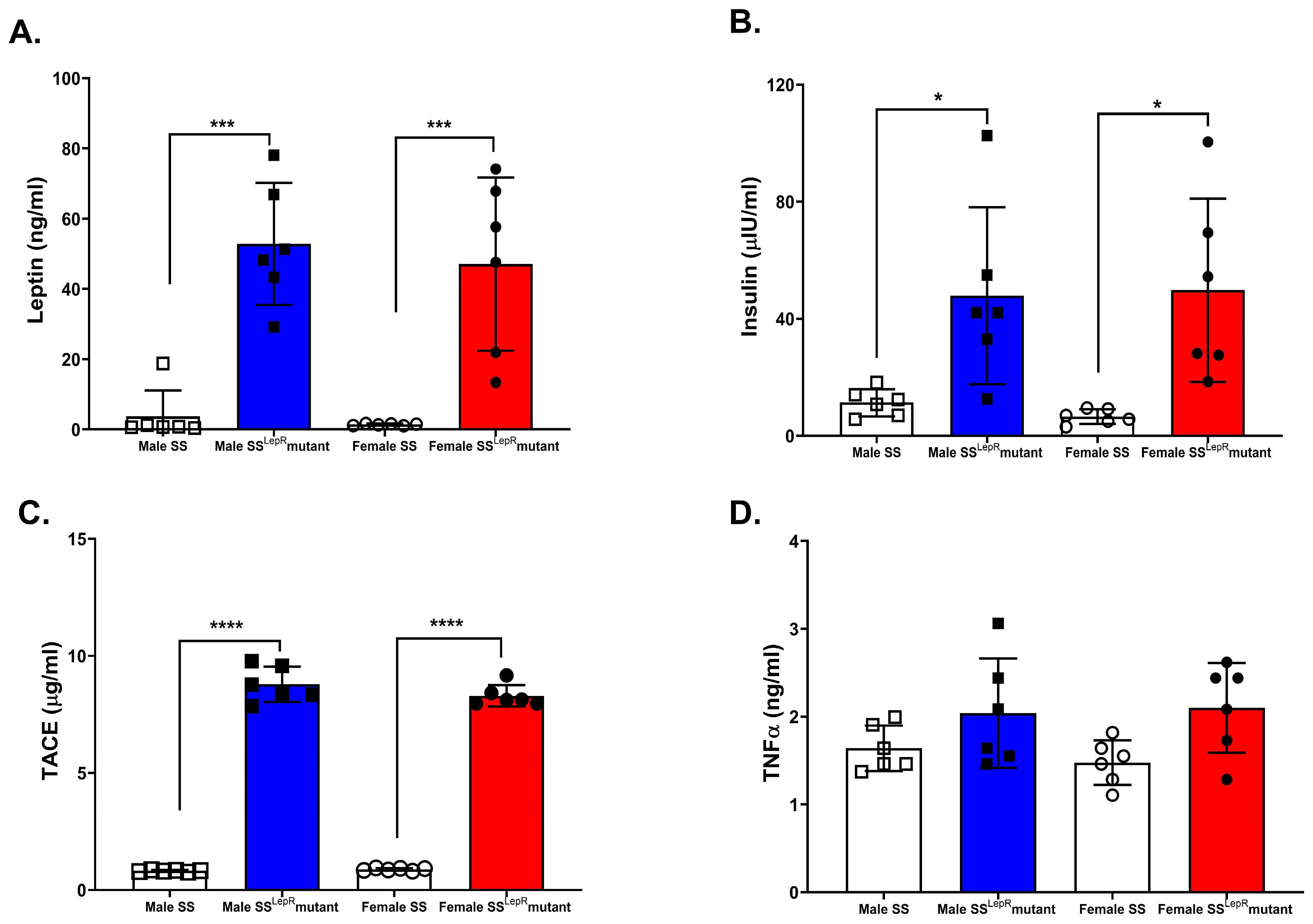 3.2. Plasma Leptin, Insulin, TACE, and TNF-α in SS and SSLepR Mutant Rats in Both Sexes