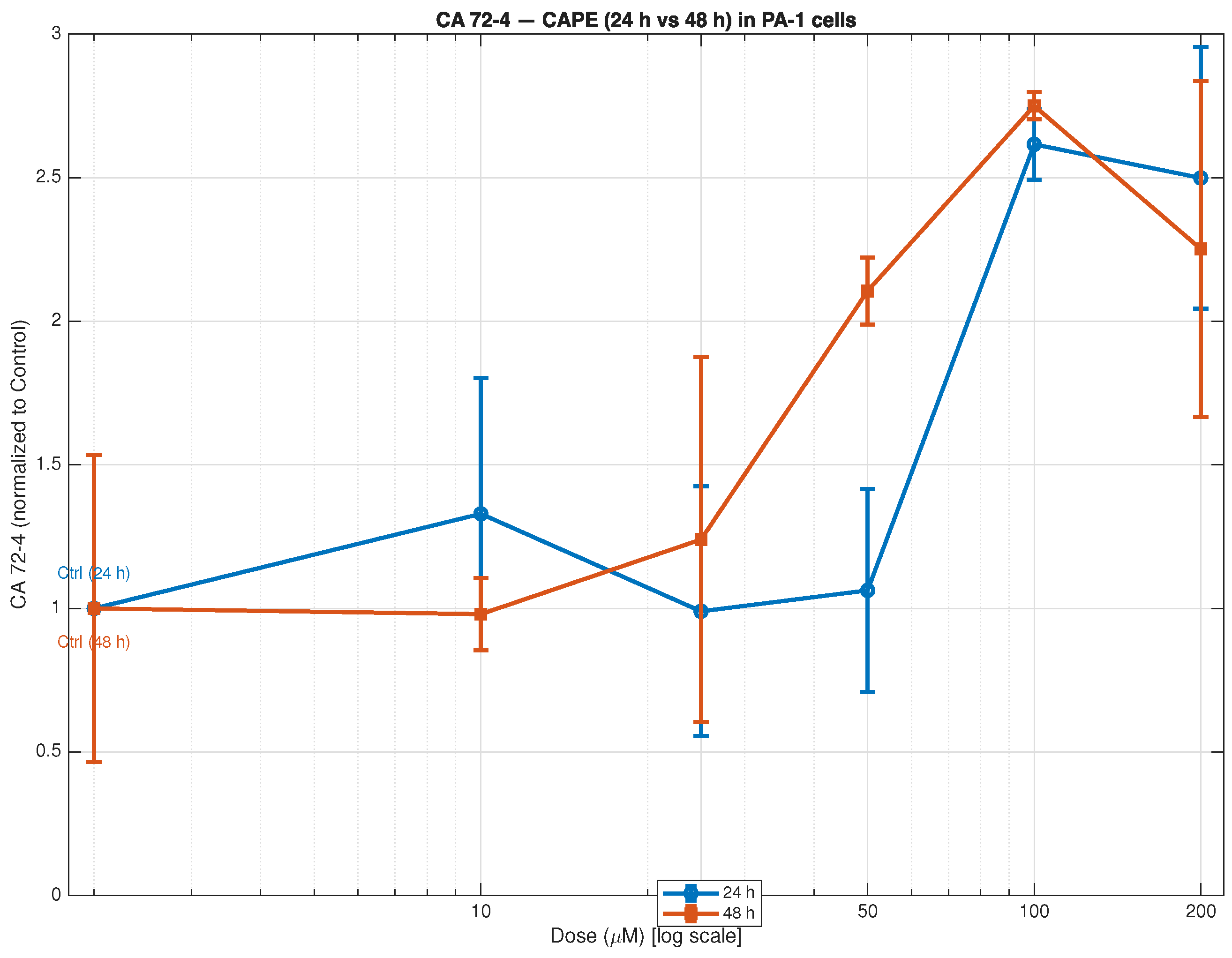 - Kleczka, A.; Dzik, R.; Kabała-Dzik, A. Caffeic Acid Phenethyl Ester (CAPE) Synergistically Enhances Paclitaxel Activity in Ovarian Cancer Cells. Molecules 2023, 28, 5813. [Google Scholar] [CrossRef]