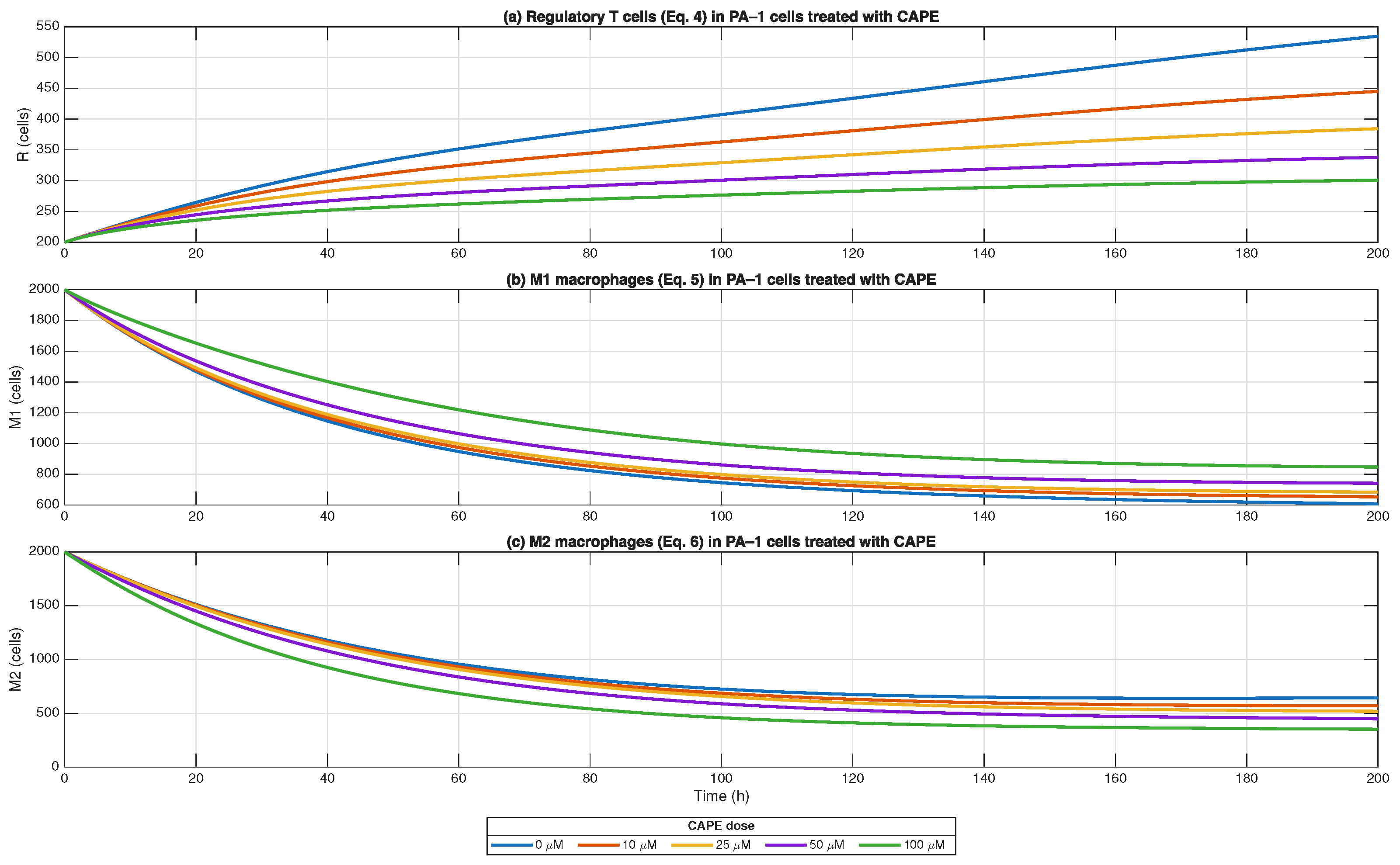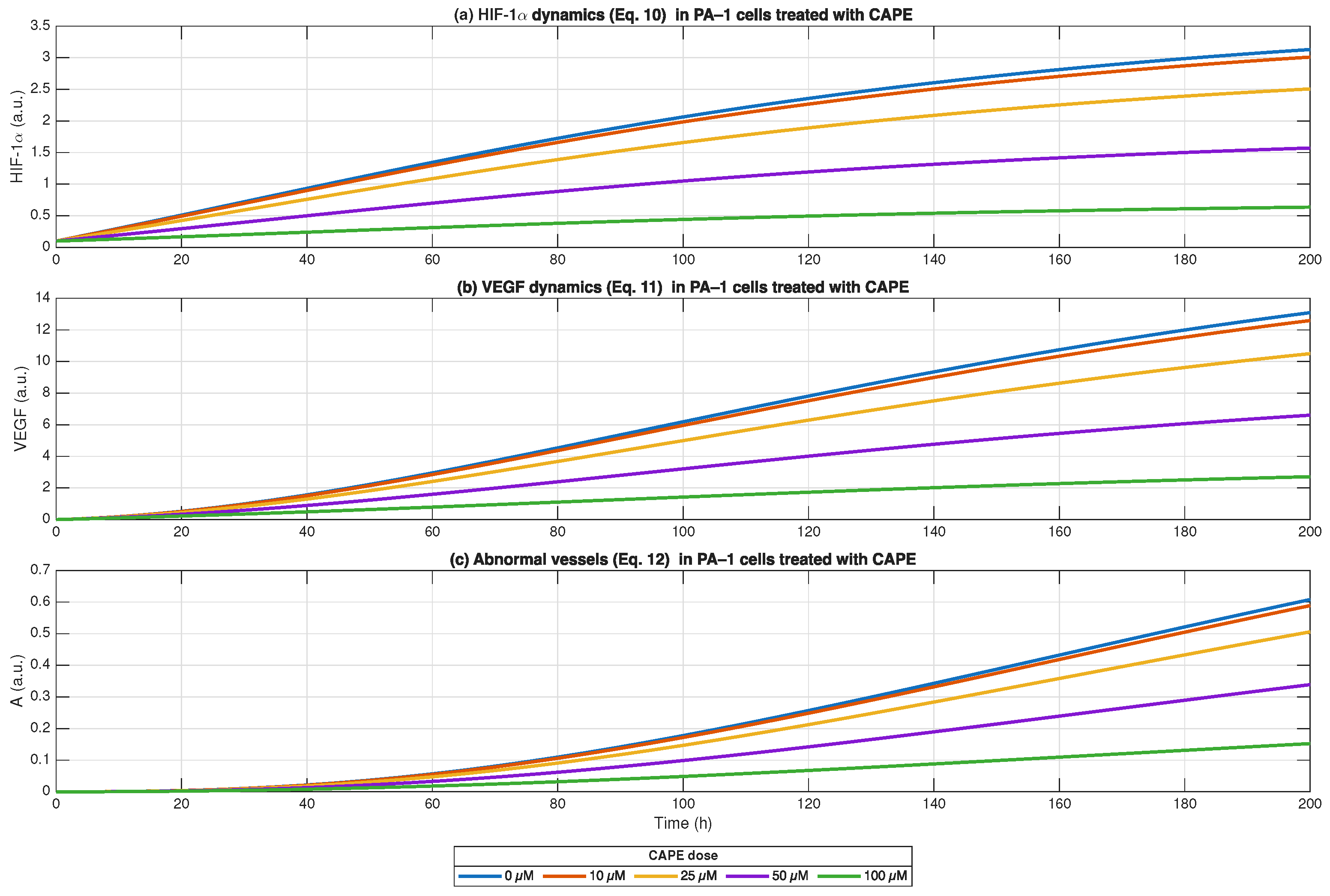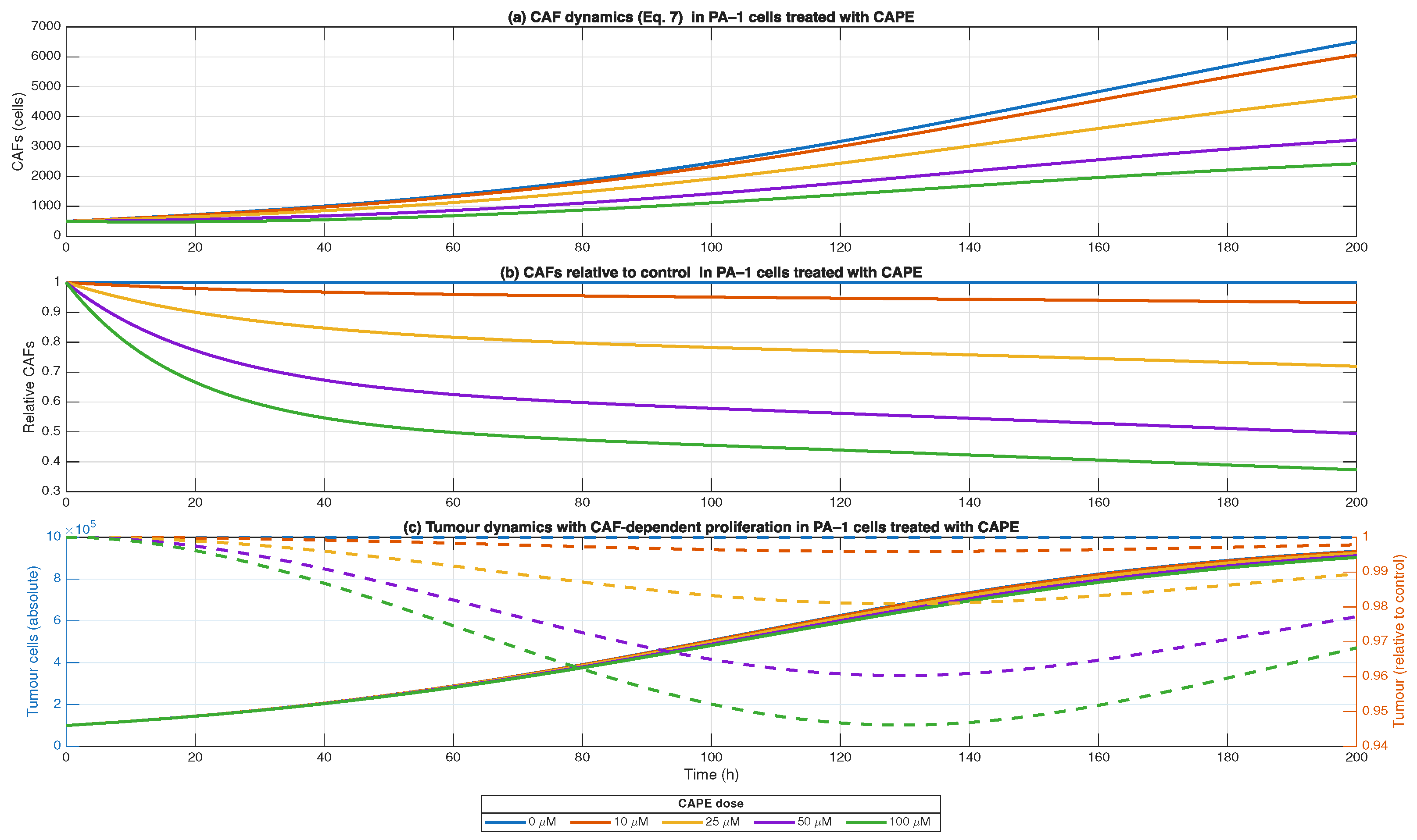 | Strength of CAPE-mediated suppression of CAFs (applied via Hill function ) | h−1 | Calibrated in this study (initial guess ; final value obtained by fitting CAF (72 h, 100 µM) ≈ 0.5× control) | |