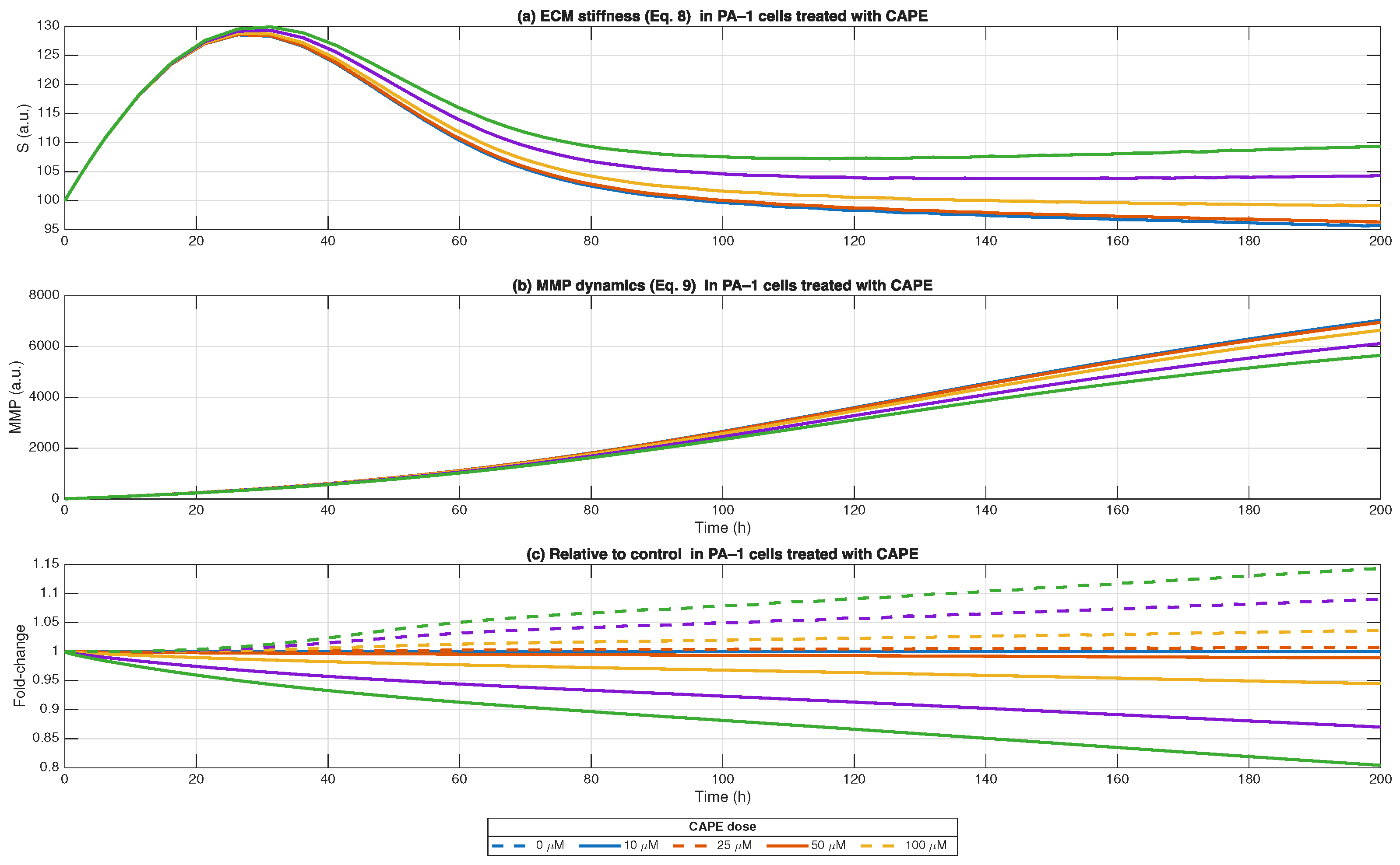 | CAPE effect on MMP degradation (strengthening factor). Chosen to complement the production effect and mimic reported MMP-suppressive actions of phytochemicals. | dimensionless | 0.5 [53] | |