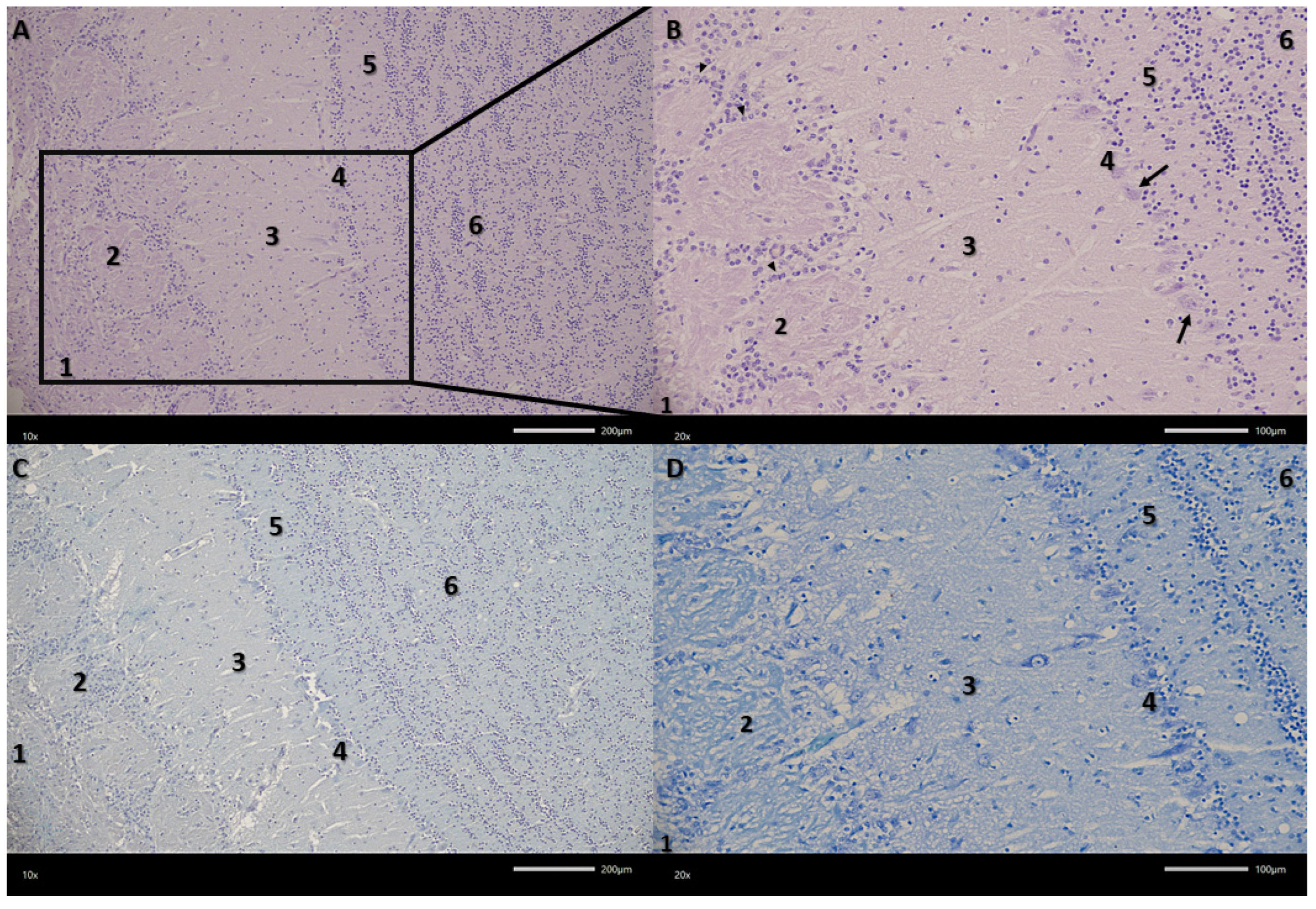 Microphotograph of representative section through the olfactory bulb. (A,B) Haematoxylin and eosin (HE) staining, (C) Alcian blue-PAS staining, (D) toluidine blue staining. The six layers of the olfactory bulb: 1—olfactory nerve layer; 2—glomerular layer; 3—external plexiform layer; 4—mitral cell layer; 5—internal plexiform layer; 6—granular cell layer; arrowhead—periglomerular cell; arrow—mitral cell. Magnifications (A,C) 100×, (B,D) 200×. Scale bars (A,C) 200 μm, (B,D) 100 μm.