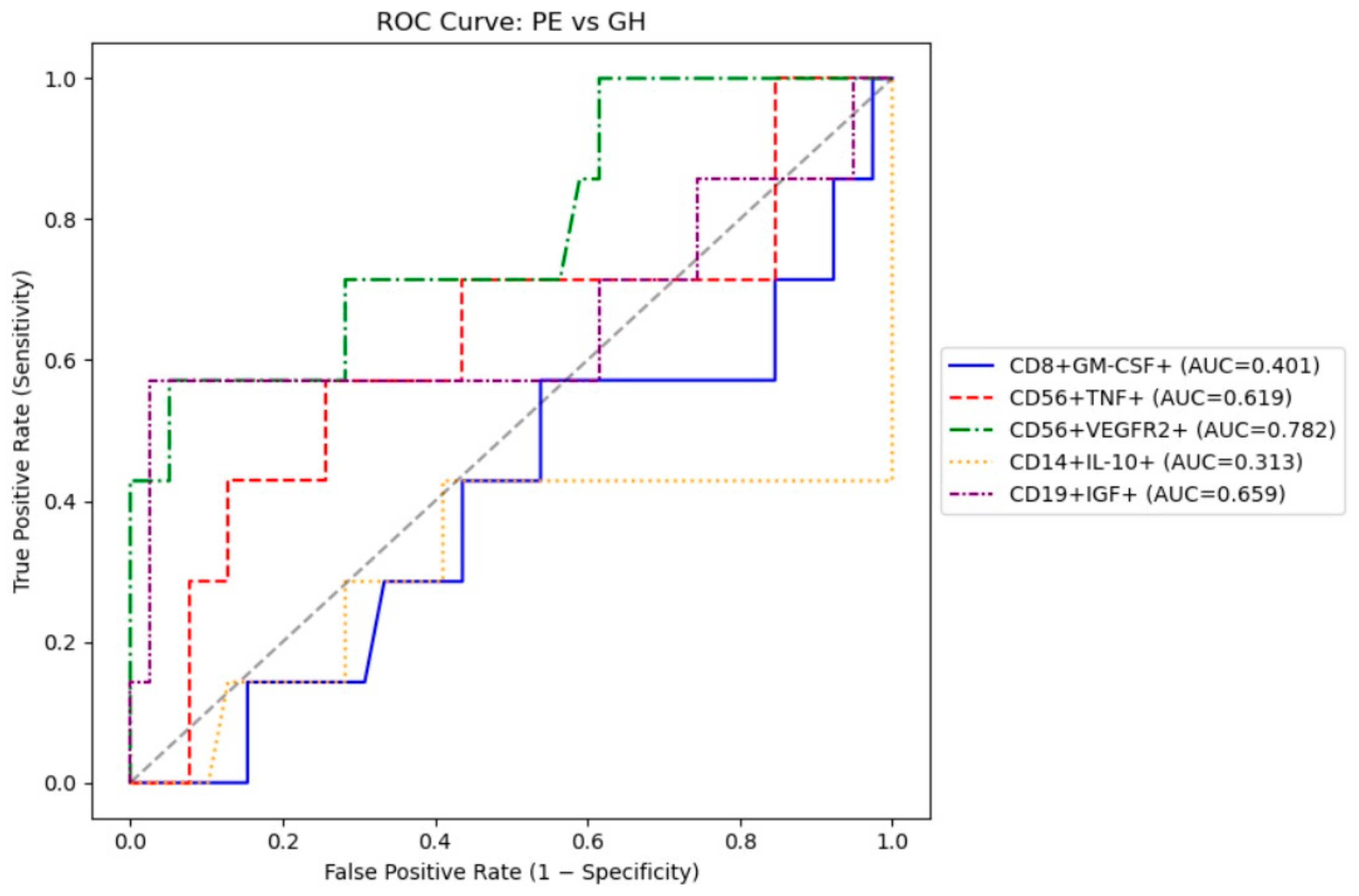The most optimal marker for differentiating preeclampsia and gestational hypertension were CD56+VEGFR2+ and CD19+IGF+ with AUC ~0.66–0.78), both achieve moderate 57% sensitivity and good specificity (>95%) (