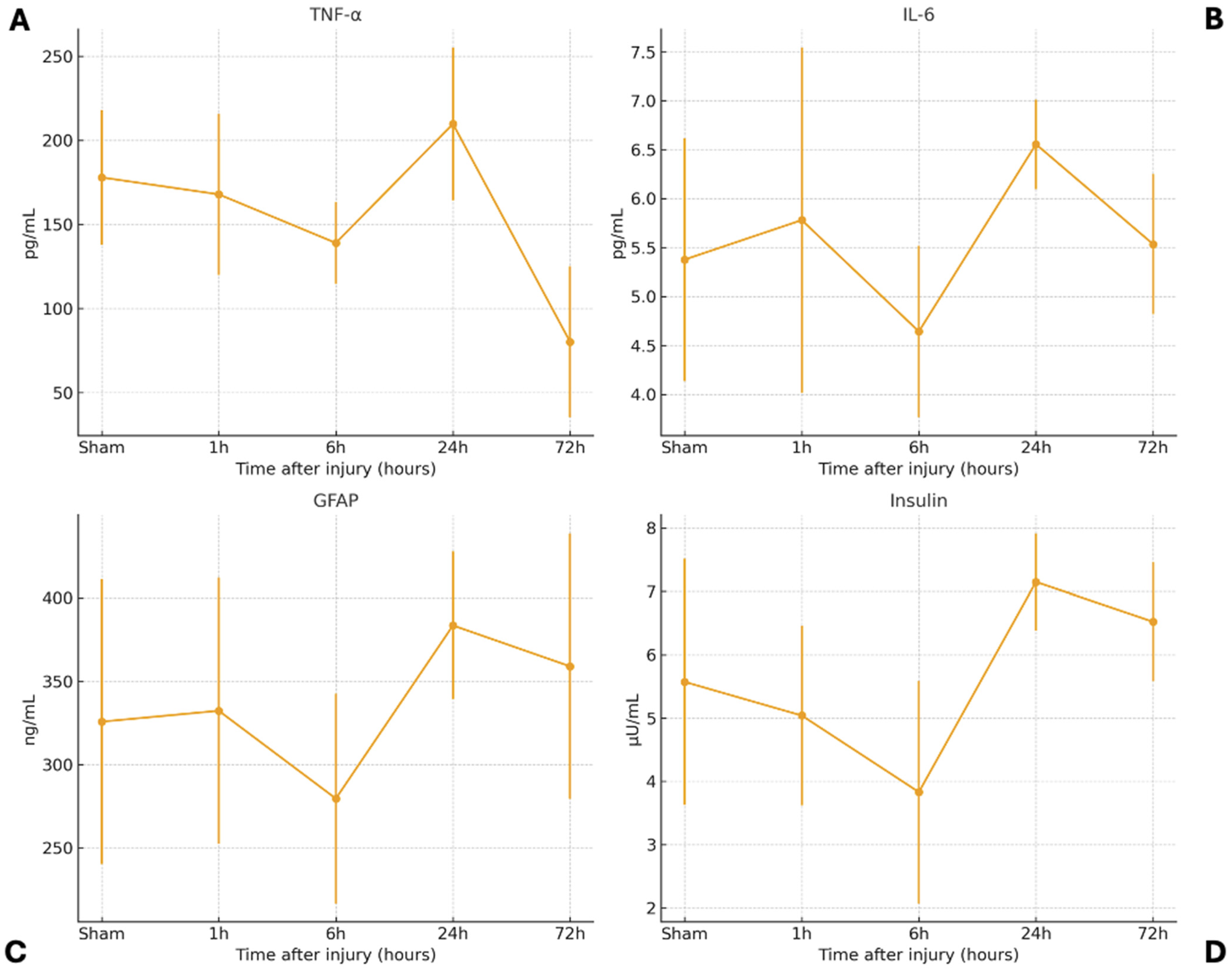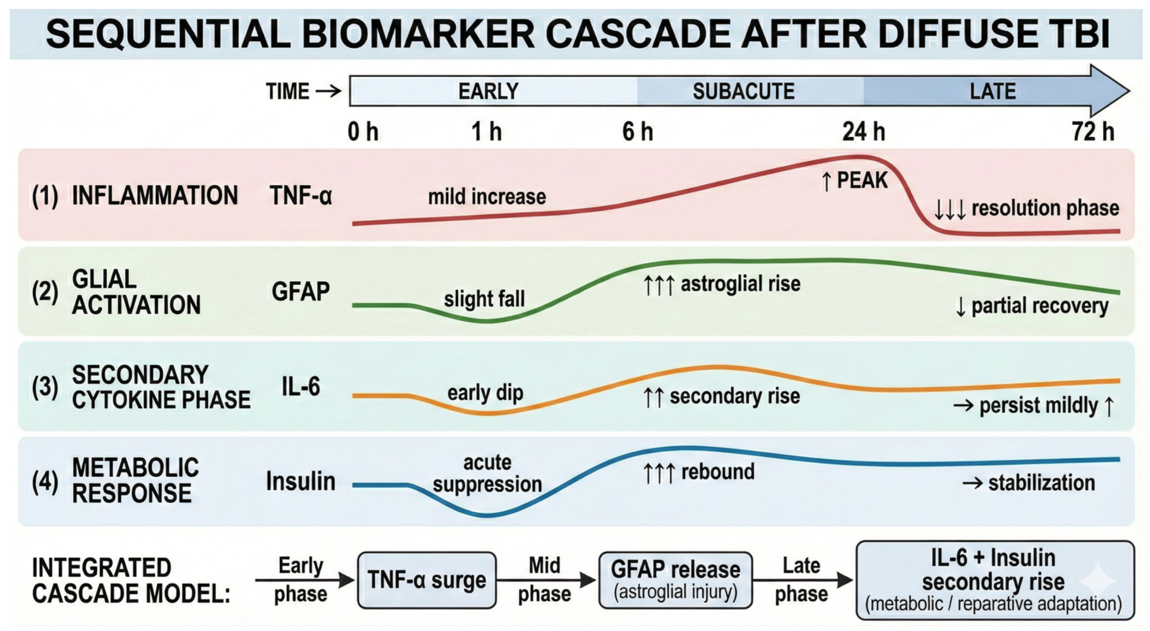 The temporal serum profiles of TNF-α, IL-6, GFAP, and insulin following diffuse TBI are summarized in