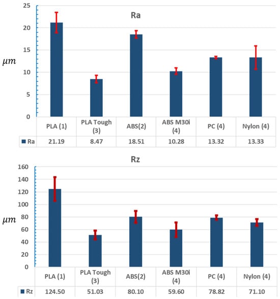 Mean roughness (Ra) and mean roughness depth (Rz) value in μm of the devices made in different materials. The number in parentheses indicates the printer with which the piece was made. The mean value can be seen in blue and the variability obtained for each combination of material and printer in red.