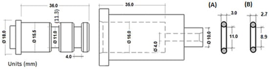 The chosen geometry for the pneumatic cylinder is shown in Figure 6. The diameter of the hole d = 16 mm, and the O-rings used are the most critical element as the quality of their contact determines the functionality of the device. Two types of O-ring were used: O-ring type A) in Figure 6 was mounted on a groove with diameter of 11.0 mm, and O-ring type B) was mounted on a groove with diameter of 11.3 mm. These combinations were used in order to reduce friction and pressure losses. As in other engineering problems, numerous combinations could have been used.