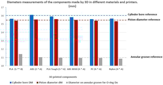Mean values measured diameters of the piston, cylinder and annular groove printed in different materials with different printers (mm). The measurement specified in the .stl files is indicated, for each component, by a dotted line. The number in brackets refers to the type of 3D printer, the groove diameter in the piston (* 11.0 mm and ** 11.3 mm) and the letters A and B are used for the two O-ring configurations.