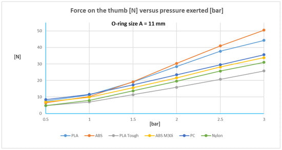 The roughness of the printed surfaces and the dimensional tolerances of the pneumatic piston, responsible for exerting the force on the thumb, affect the value of the effort and the necessary repeatability, varying from one printer to another and even between different materials in the same printer (Figure 5). Nevertheless, it is possible to find suitable designs, combining the printed parts with adequate dimensions of the piston and the O-rings used, which allow ensuring the reliability of the measures for their use in a pain meter (Table 2).
