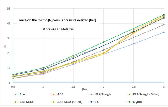 The linear trend relating working pressure to exerted force is similar for all materials for the designs with both O-rings (A in Figure 10, B in Figure 11).