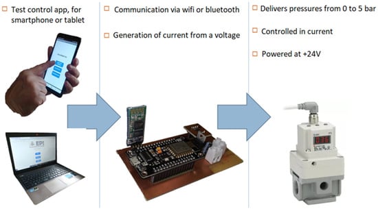 The industry offers multiple possibilities to make pressure regulations. The SMC model ITV3030 (SMC, Vitoria, Spain) was selected. This model has a control pressure ranging from 0.05 bar to 5 bar with a DC control signal type of 4 mA to 20 mA (https://www.smc.eu/es-es, accessed on 19 December 2024).