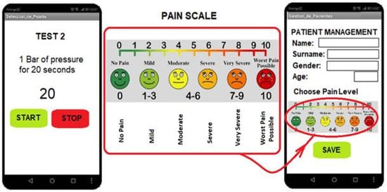 An application has been developed for the processing and storage of patient and pain sensation data. The doctor discusses the scale with the patient at the start of the test and can relate the pressure exerted and the patient’s response to the image shown simultaneously by the MRI scanner. The pain scales used in the diagnosis of fibromyalgia have been widely studied [,]. It is necessary to establish a pain scale to study and relate a stimulus, established in intensity and duration, to the patient’s response. In this way, the evolution over time of a patient’s condition can be contrasted or compared with other patients. Figure 14 shows the interface of the application developed for this purpose with the scale commonly used by neurologists in which the patient indicates a degree of pain from no pain to the worst possible pain.
