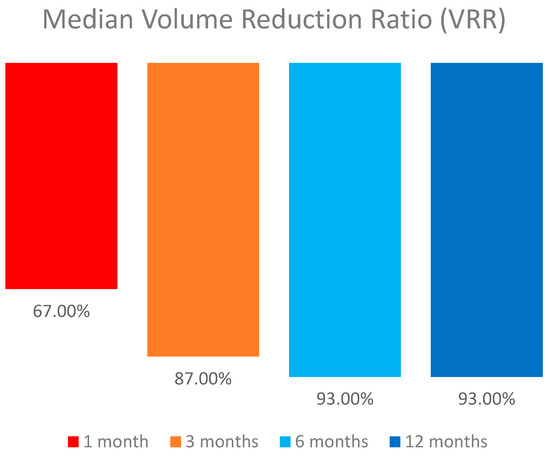 We recorded the lesions’ volume reduction after RFA was performed. The median volume of the lesions reduced significantly from 0.24 mL (IQR: 0.24, range: 0.09–0.9) to 0.02 (IQR: 0.01, range: 0–0.03), (p = 0.001) with a median volume reduction ratio (VRR) of 94.5% (IQR: 3.25, range: 78–100) (Table 2 and Table 3). The median VRR increased from 67% in 1 month to 93% in the 12-month follow-up (Figure 1). The volume reduction ratio was calculated as follows: