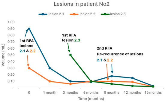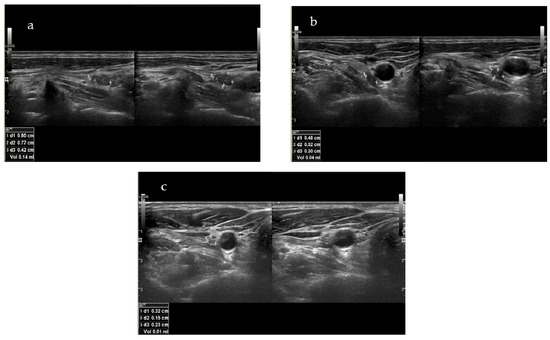 Indicatively, the targeted lesion of patient No4 (i.e., the patient with the longer f-up) is depicted in Figure 2a–c, before RFA, at one month after RFA, and at the final f-up 24 months after RFA, respectively. Out of 14 lesions that were treated, 2 (14.3%) were no longer visible in the U/S.