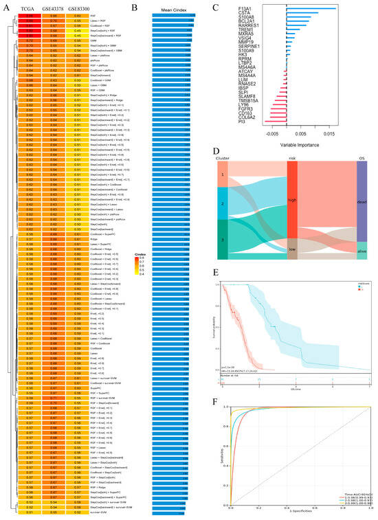 Establishment and validation of the prognostic model. (A) The C-index of the prognostic models. (B) The mean C-index of each model across all datasets. (C) Variable importance in RSF. (D) Sankey diagram showing the relationship between cluster, risk, and OS. (E) Kaplan–Meier OS analysis of three clusters in TCGA-GBM cohort samples (p = 1.1 × 10−20). (F) Time-dependent ROC analysis for predicting OS at 1, 2, and 3 years in TCGA-GBM cohort samples.
