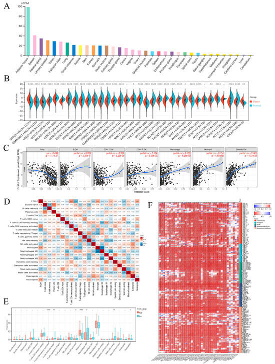 Differential expression analysis of F13A1. (A) The RNA expression of F13A1 in normal tissues. (B) The RNA expression of F13A1 in different cancers compared with normal group. (C) The correlation between F13A1 and six types of immune cells and purity. (D) The heat map shows the correlation between F13A1 and immune cells. (E) Comparing the expression of immune cells in the high- and low-F13A1 group. (F) The heat map shows the correlation between F13A1 and immune regulatory genes.* indicates p < 0.05, ** indicates p < 0.01, **** p < 0.0001.