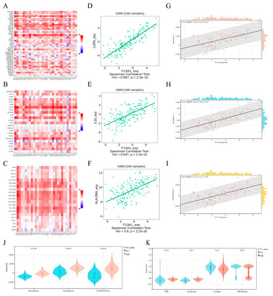 Immunity analysis of F13A1. (A) The heat map shows the correlation between F13A1 and immunostimulator in different cancers. (B) The heat map shows the correlation between F13A1 and immunoinhibitor in different cancers. (C) The heat map shows the correlation between F13A1 and MHC molecules in different cancers. (D) The scatter plot shows the relationship between F13A1 and IL2RA in GBM. (E) The scatter plot shows the relationship between F13A1 and IL10 in GBM. (F) The scatter plot shows the relationship between F13A1 and HLA-DRA in GBM. (G) The scatter plot shows the relationship between F13A1 and ImmuneScore in GBM. (H) The scatter plot shows the relationship between F13A1 and StromalScore in GBM. (I) The scatter plot shows the relationship between F13A1 and ESTIMATEScore in GBM. (J) Comparing the immune score in the high- and low-F13A1 group. (K) Comparing the TIDE prediction scores in the high- and low-F13A1 expression group.